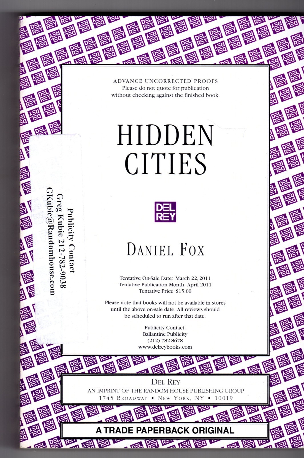 Daniel Fox HIDDEN CITIES First edition Advance Proof Ballantine Chaz Brenchley