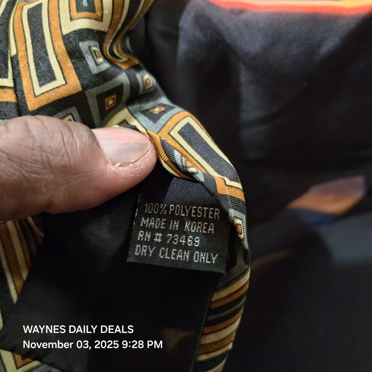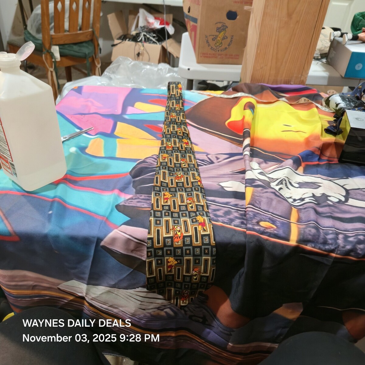 Fun vintage Disney ?Pooh? tie featuring Winnie the Pooh in a stylish geometric square pattern. Made in Korea from 100% polyester, it?s a great collector?s piece or a playful accent for casual or themed outfits. Brand: Disney ?Pooh? Material: 100% Polyester Color: Black, Gold, and Orange with Pooh Character Design Origin: Made in Korea Condition: Excellent pre-owned Care: Dry clean only