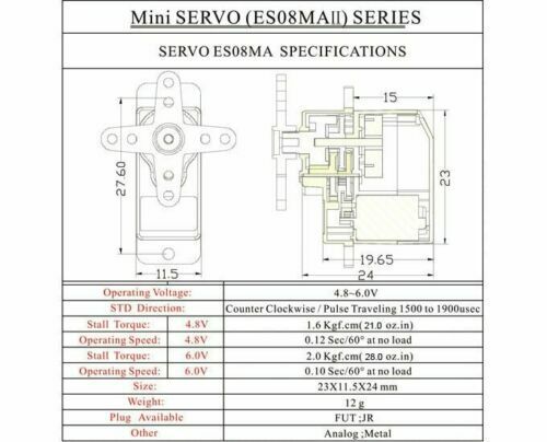 Speed: 0.12sec/60o at 4.8V; 0.10sec/60o at 6V