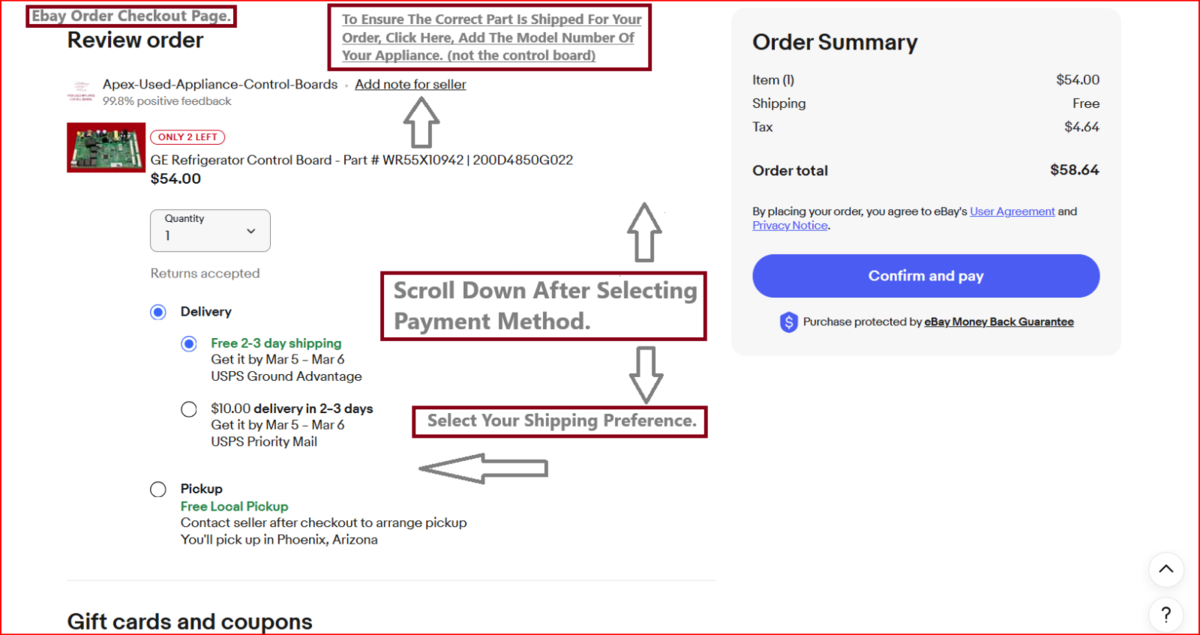 Apex Used Appliance Control Boards "The Highest Point In Quality - At the Lowest Point In Pricing." A+ BBB Accredited Business SIMPLE AND FAST! Same Day Shipping - Priority Mail 2-3 Day Delivery On Every Order! Our Control Boards Are Tested, Cleaned, And Come with a 6-Month Warranty. Electrolux Refrigerator Main Control Board - Part # A01164906 | 242009010 Mobile users, click the upper to see the item condition details. Click the lower to see the full product description. Reuse Reduce Recycle **This board fits the following model numbers** EI23CS55GB4 EI23CS55GB5 EI23CS55GS4 EI23CS55GS5 EI23CS55GW4 EI23CS55GW5 EW23CS65GB4 EW23CS65GS4 EW23CS65GW4 EW23CS70IB2 EW23CS70IB3 EW23CS70IB4 EW23CS70IS2 EW23CS70IS3 EW23CS70IS4 EW23CS70IW2 EW23CS70IW3 EW23CS70IW4 Cross-Reference Information: Part Number A01164906 replaces AP5957491, 5303918559, 242009010, 242009020, 242009032A, 3516029, 5303918524, PS10066353 This is a factory original used part. The best way to ensure this is the correct replacement for your appliance is to match the part number on the sticker of your original board to the number listed in the title of this ad. (See picture) All of our used appliance repair parts have been tested and cleaned, and are guaranteed to work. Every part comes with a 6-month warranty. Please provide the model number of the appliance you are repairing with your order. ("Message To Seller" link on checkout page) So we can confirm the proper fit before shipping. This will prevent the frustration of having the wrong part mistakenly sent out. Refunds, returns, etc. Please do not order a part just because it looks similar to what is currently on your machine. Appliance parts look the same, but they are not the same. Wiring, function, fit, etc., could be different, and thus make the part unusable. Each part has an individual part number that is model-specific. It is important to be certain that the part you are ordering is the one you need. If in doubt, email us your model number, and we can confirm the part number for you. If you have a question or need to return an item, click ?Contact Seller?. Then let us know how we can help you with the order. Also, see the Returns tab below for more information. Our pledge is to do whatever it takes to make your experience with us 100% satisfactory. Thank You! R-188 Payment Shipping Returns Item Condition Scale Payment Shipping Returns Item Condition Scale ??????????????????????????????????????????We accept payment by any of the following methods: PayPal and all Credit Cards. Please pay as soon as possible after acceptance of "Best Offer". will automatically open a case for non-payment after 72 hours. Thanks! Your order will be processed within 24 hours of receiving payment (1 business day). You should expect to receive it one to five days after the item has been shipped. We ship every item using USPS, Ground Advantage (free) or buyer pays Priority Mail (2-3 Days) expedited shipping. In the unlikely event that your item is lost or damaged during shipping, we will issue either a full refund or offer a replacement. You can return a product up to 6 months from the purchase date. All items must be returned in undamaged condition, so please take care to repack them safely. The buyer is responsible for return shipping costs after 60 Days. Refunds are issued when the item arrives and after it is re-tested. All returned items must have the Apex Used Appliance Control Boards mark and SKU barcode on them to be eligible for a refund. Total refund is 100% of the purchase price. One thing we ask of you is, to let us know why you need a refund. This helps us determine the reason for the return and to process your refund faster. Please leave us some basic information in the box like the examples below, along with contact info including an email address. Didn't fix my appliance. ( I still have the same problem as before. Not the same as my Original part. (different fit, wiring, functions.) Changed my mind. Etc. Excellent: This item shows only minimal signs of use. Good: This item shows general wear and will have light scratches and scuffs or possibly a small nick or ding. Fair: This Item does show noticeable wear, it will have marks, scratches, cracks, small nicks or dings.??????? * The pictures in this ad are stock images and may or may not be the item that is delivered. The item could vary slightly from the photos. The items cosmetic condition is in the "Condition" section at top of the ad (if applicable). Mobile users, click the upper gt; to see the item condition details. Click the lower gt; to see the full product description. ------------------------------------------------------------------------------------------------------------------------------- ------ Reuse Reduce Recycle ----------------------------------------------------------- **This board fits the following model numbers** EI23CS55GB4 EI23CS55GB5 EI23CS55GS4 EI23CS55GS5 EI23CS55GW4 EI23CS55GW5 EW23CS65GB4 EW23CS65GS4 EW23CS65GW4 EW23CS70IB2 EW23CS70IB3 EW23CS70IB4 EW23CS70IS2 EW23CS70IS3 EW23CS70IS4 EW23CS70IW2 EW23CS70IW3 EW23CS70IW4 Cross-Reference Information: Part Number A01164906 replaces AP5957491, 5303918559, 242009010, 242009020, 242009032A, 3516029, 5303918524, PS10066353 This is a factory original used part. The best way to ensure this is the correct replacement for your appliance is to match the part number on the sticker of your original board to the number listed in the title of this ad. (See picture) --------------------------------------------------------------------------------------------------------------------------------------------------------------------------------------------------------------------------------------------- ------ All of our used appliance repair parts have been tested and cleaned, and are guaranteed to work. Every part comes with a 6-month warranty. ------------------------------------------------------------------------------------------------------------------------------------