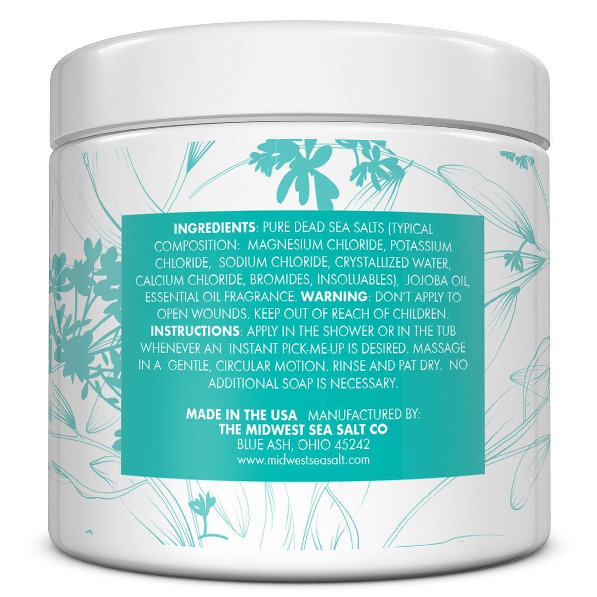 Pure Dead Sea Salts (Typical Composition: Magnesium Chloride, Potassium Chloride, Sodium Chloride, Crystallized Water, Calcium Chloride, Bromides, Insoluables), Jojoba Oil, Essential Oil Fragrance.