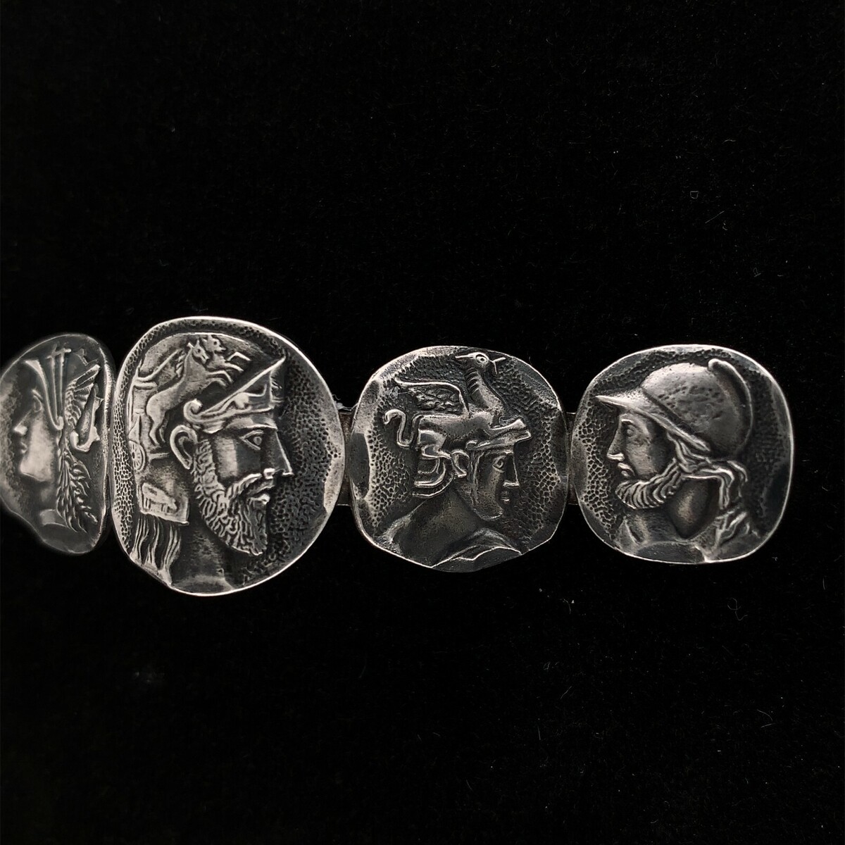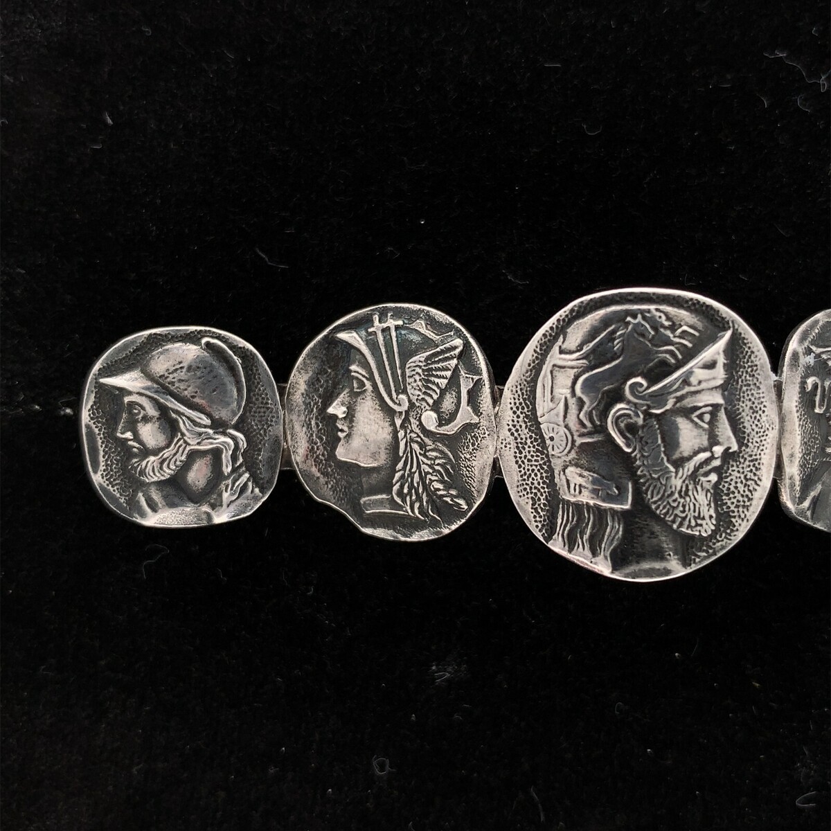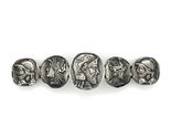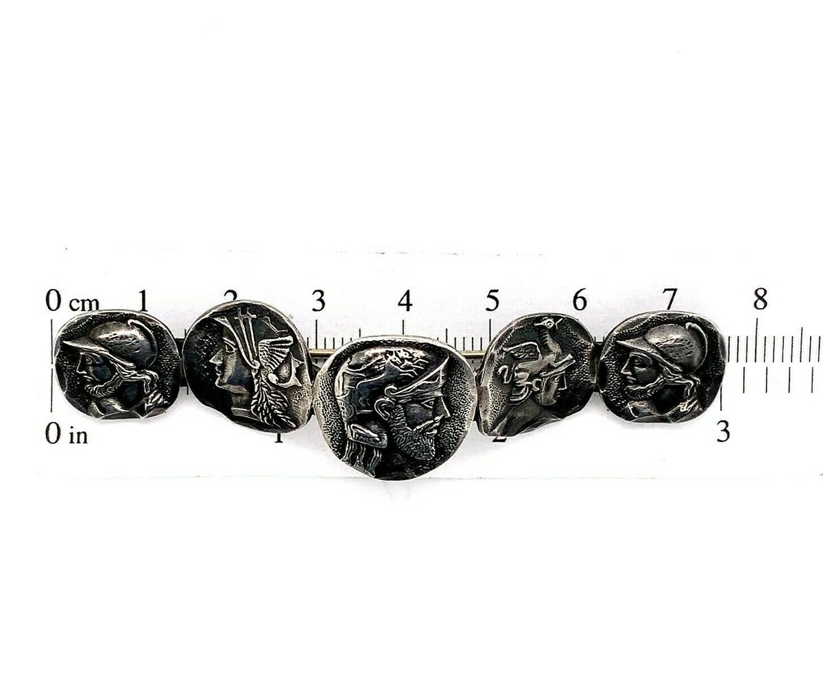 Antique sterling silver medallion scarf pin with five different figural medallions. The pin measures 2 7/8" long and 3/4" wide. The medallions are rustic Greek/Roman style. The pin weighs 10.17 dwt., and dates from the 1880-90's. Made by Frank Whiting. Wonderful!