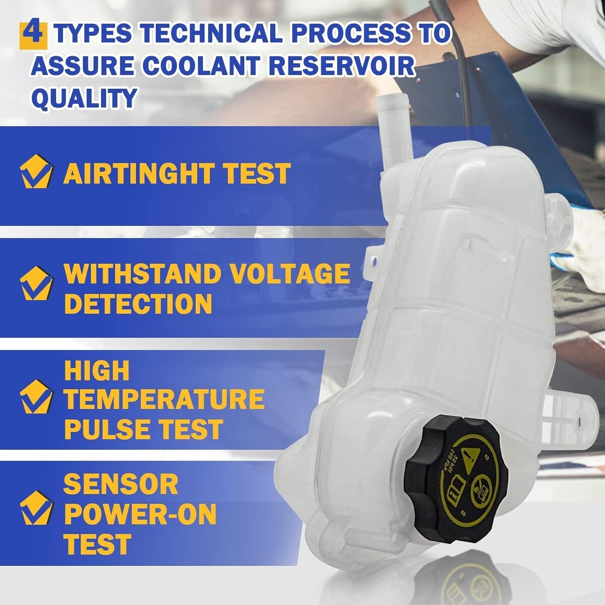 The coolant reservoir expansion recovery tank with cap is made from high quality plastic materials can withstand excessive heat and vibration, light and durable, translucent, you can directly see the liquid level of the antifreeze inside, without opening the radiator cover. While this is not a genuine OEM part, it is a direct replacement and good value.