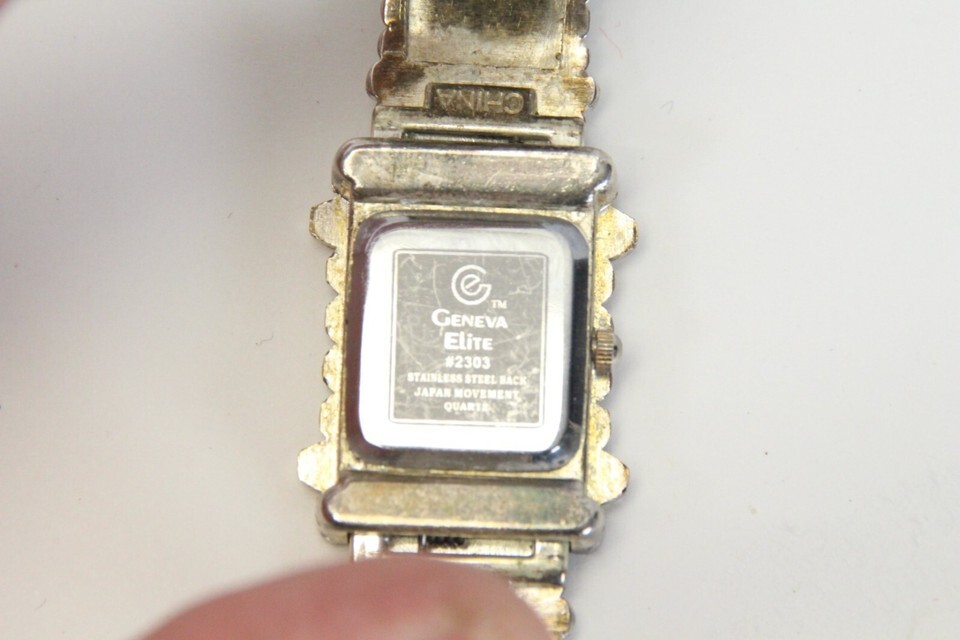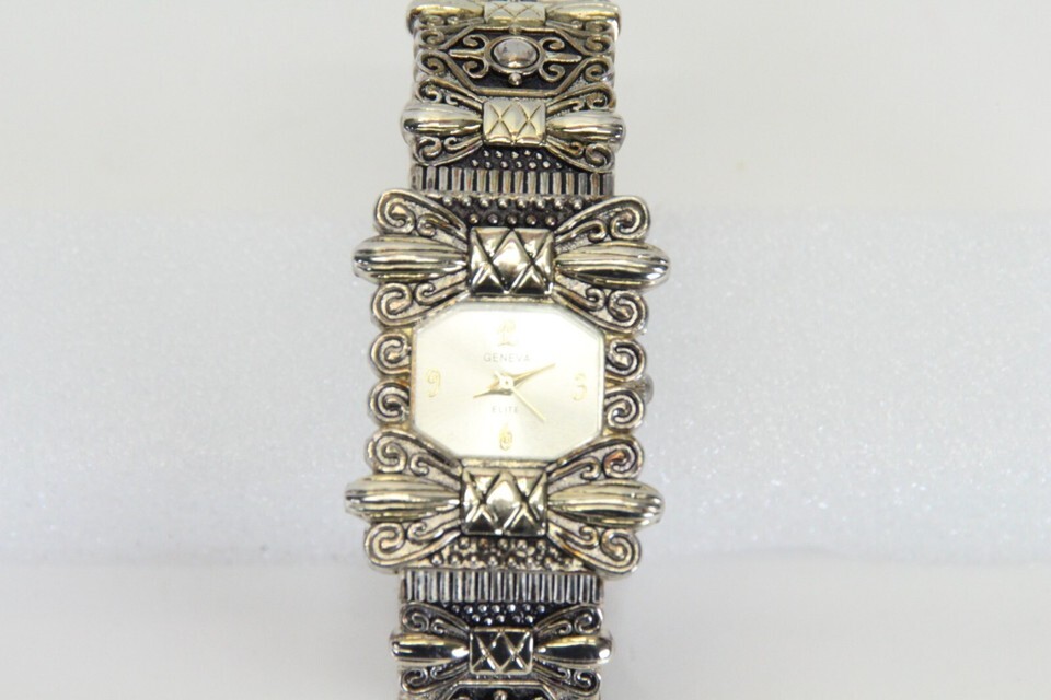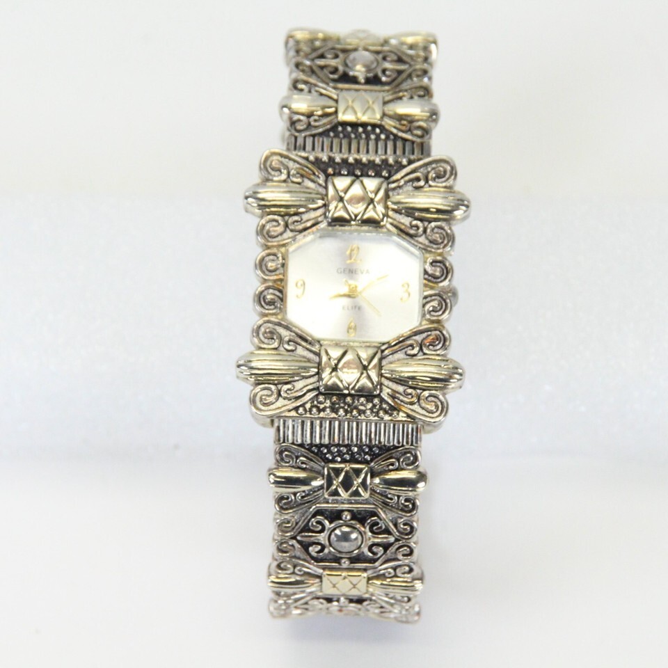 - Geneva Elite Wristwatch Silver Tone Rectangular Silver Face Beige Cuff Band