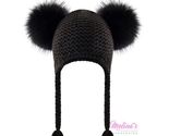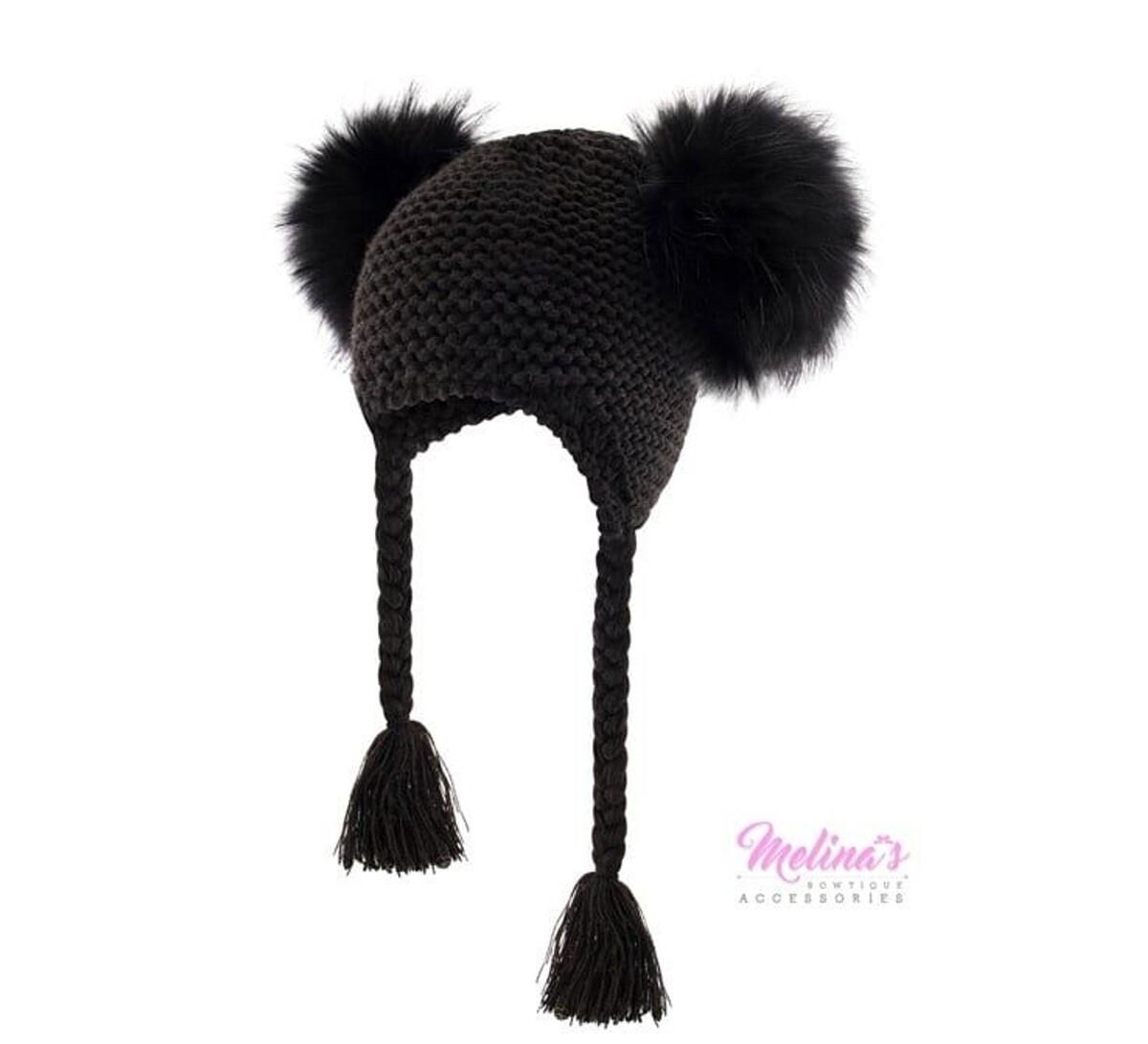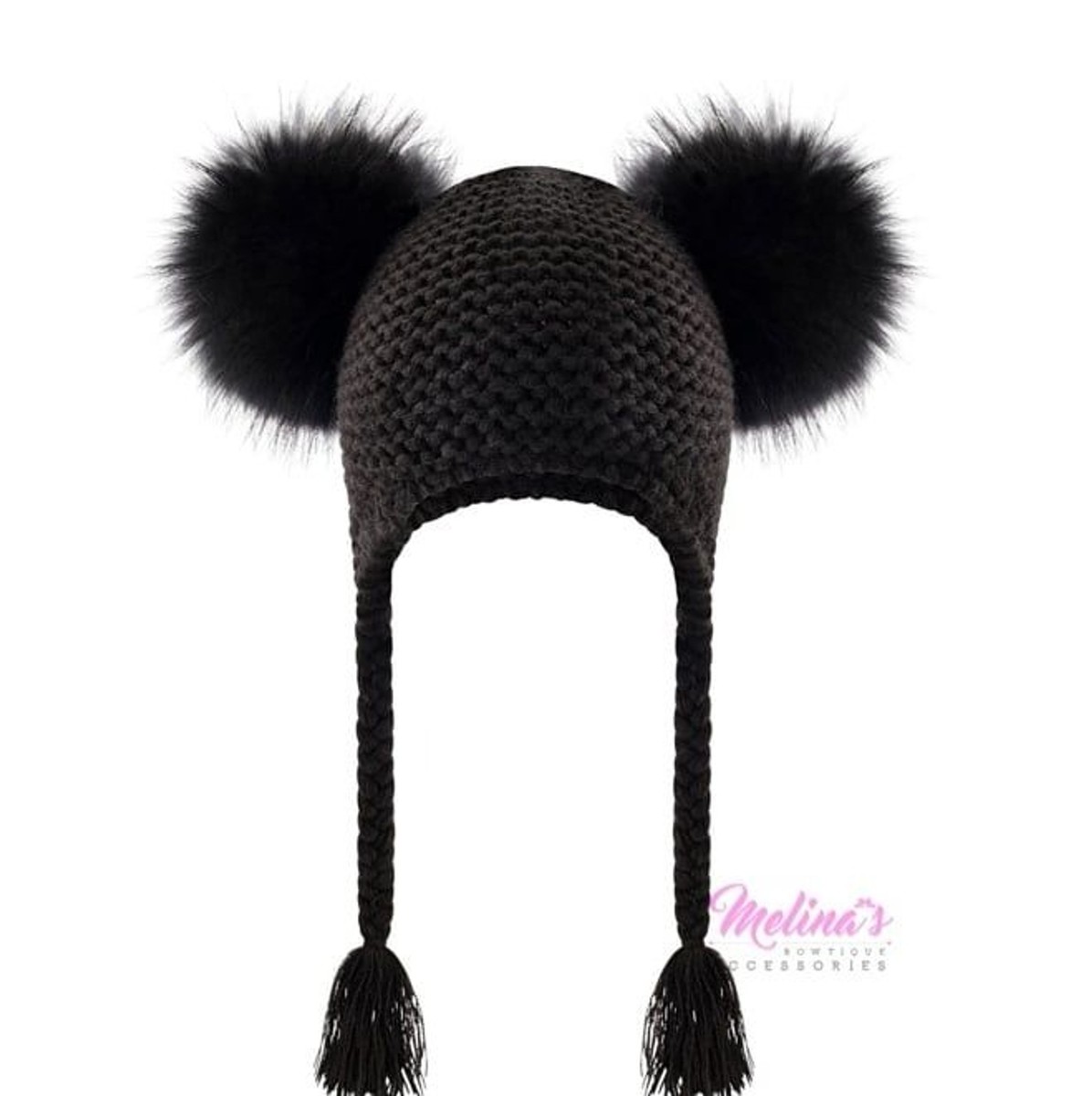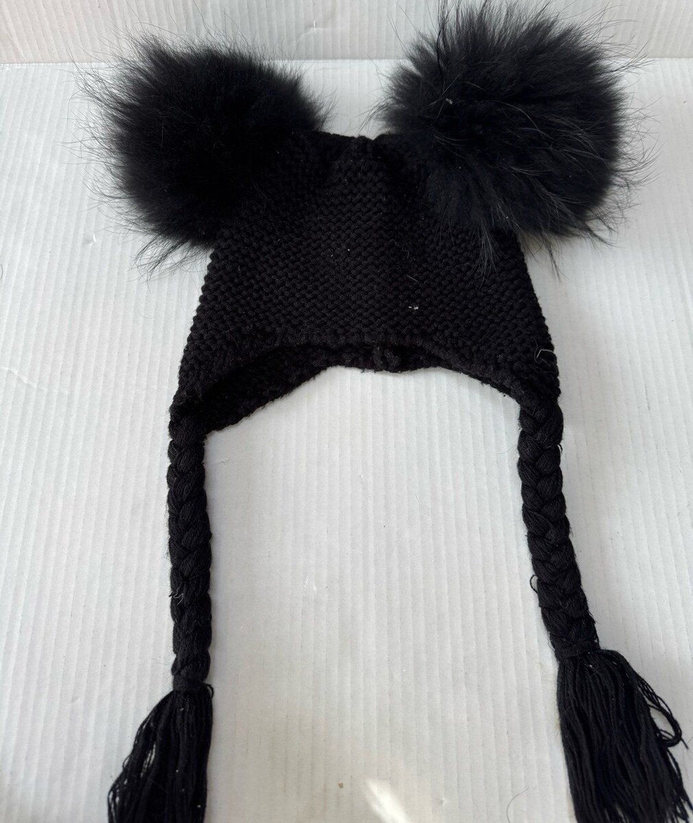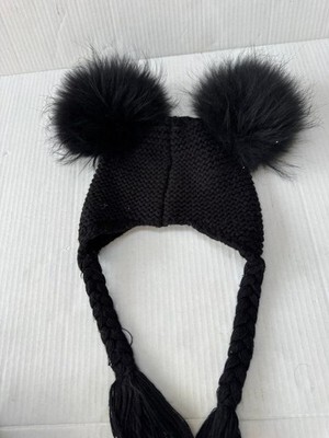 - Girls Toddler Black Double Pom Knit Hat w/ Braids Angora Ear Fur