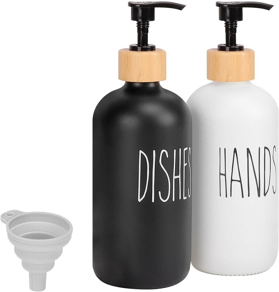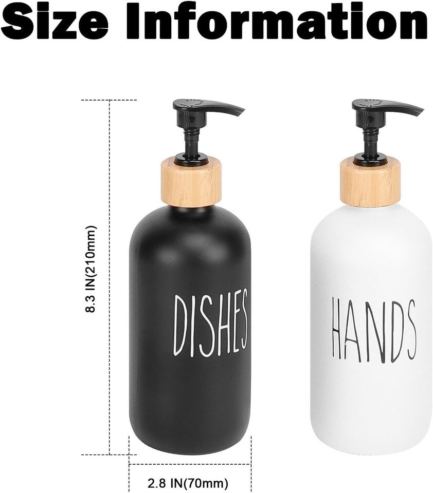 Stand not included. About this item PREMIUM MATERIALS: Soap dispenser made of premium glass, long-lasting. The style is minimalist and complements any interior REUSABLE: Designed for easy refilling, this versatile soap bottle can be reused to various liquids, providing a sustainable alternative to single-use plastic dispensers VERSATILE USAGE: Soap dispenser set has multiple purposes for your different needs! It can hold hand soap, dish soap, shampoo, conditioner, body wash, etc CONVENIENT LABELING: Soap bottles have specific text labels that can easy identification of contents, keeping mix-ups and making everyday use more convenient FUNNEL: Enjoy added convenience with funnel. This ensures that there is no confusion when adding water, enhancing the user experience and making the process effortless