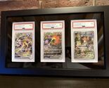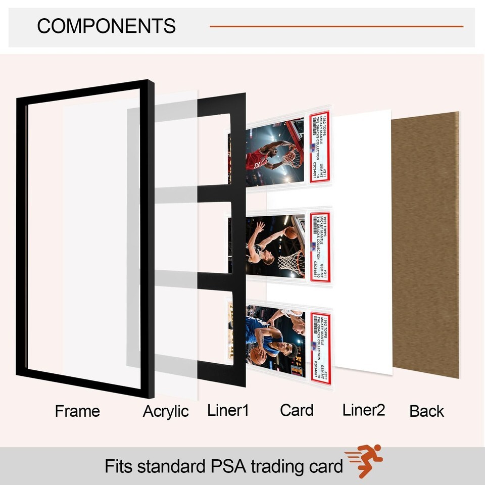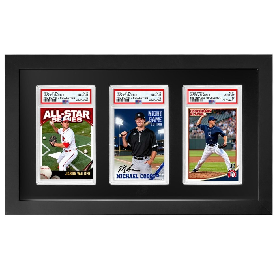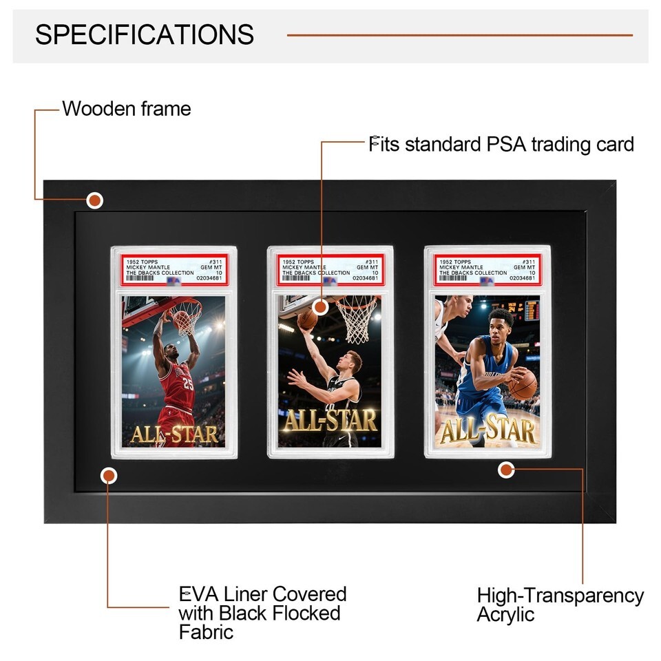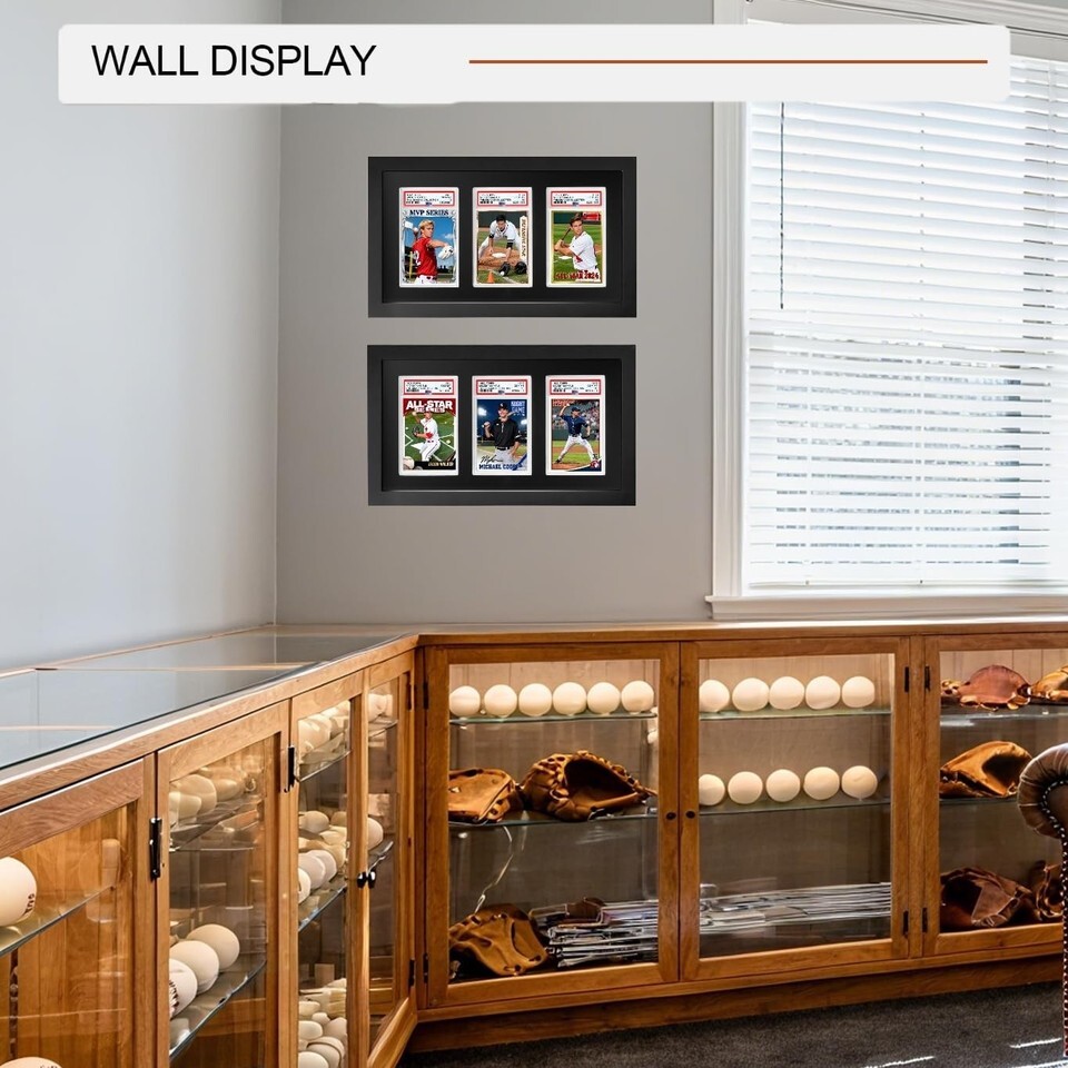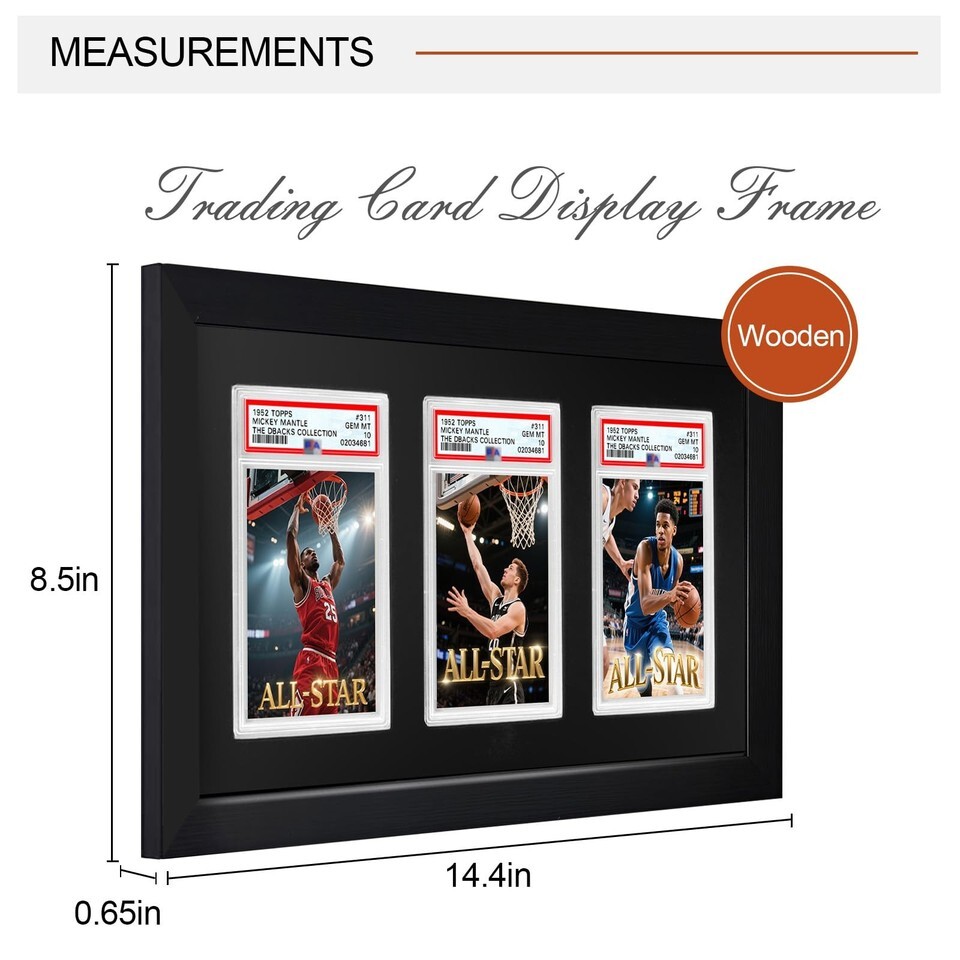 Showcase Your Best Cards Instead of keeping your valuable graded cards hidden in drawers or storage boxes, this premium display frame lets you proudly present them on the wall. Designed for PSA, CGC, and TAG slabs, it?s perfect for sports cards (baseball, basketball, football, hockey) as well as trading card games like Pokemon, MTG, and Yu-Gi-Oh. Features Wood in Black FINISH with a black background Size:14.4"L x 8.5"W x 0.65"D Item Weight: 1.1 lb Cards are not included. Premium Solid Wood Frame with Velvet Finish: Built from high-quality solid wood and lined with black velvet EVA foam, this display adds a touch of luxury while protecting your graded cards from scratches and wear. Holds 3 Graded Slabs Together: Specifically designed to fit PSA, CGC, and TAG slabs, this frame securely displays three prized cards?ideal for showcasing rare sets, themed collections, or your most valuable pieces side by side. Protective Plexiglass Cover: Clear plexiglass front provides extra protection from dust, fingerprints, and damage while keeping your cards visible in a clean, museum-style presentation. Quick No-Tool Setup: Precision-cut EVA slots hold each slab snugly in place. Simply insert your cards?no screws, nails, or complicated installation required. Wall Mount or Desktop Display: Features dual hooks for secure wall mounting as well as a flat, stable back for standing on desks, shelves, or display cases. Perfect for flexible placement in any space. Great Gift for Collectors: A stylish, practical choice for sports card fans and TCG enthusiasts?makes an excellent gift for birthdays, holidays, or special occasions. Important Compatibility Note: Designed to fit PSA, CGC, and TAG graded slabs only. Not an official product of any grading company. Compatibility refers solely to sizing and fitting purposes. We offer 1-5 Days Free shipping 30-Days Free returns