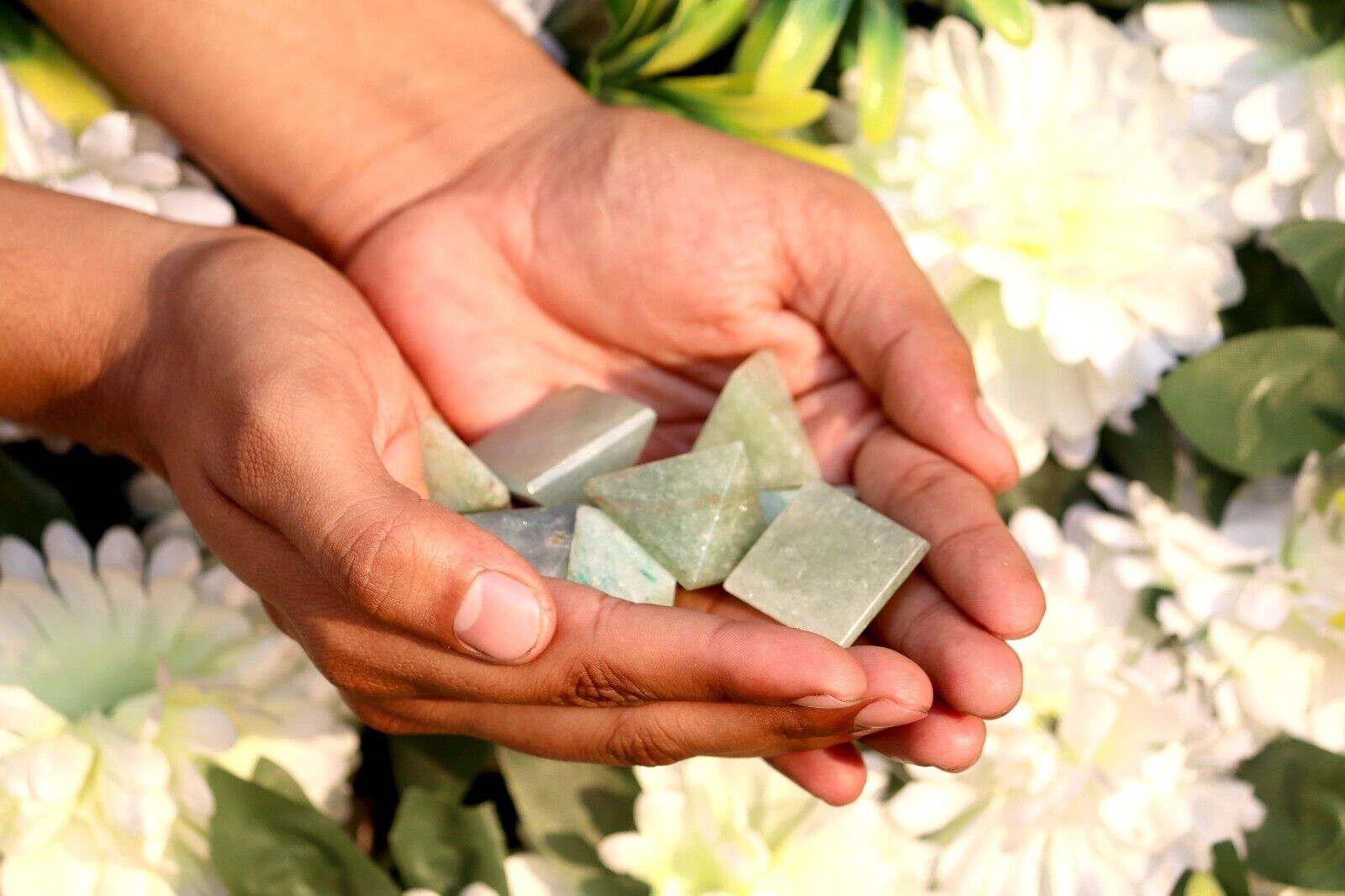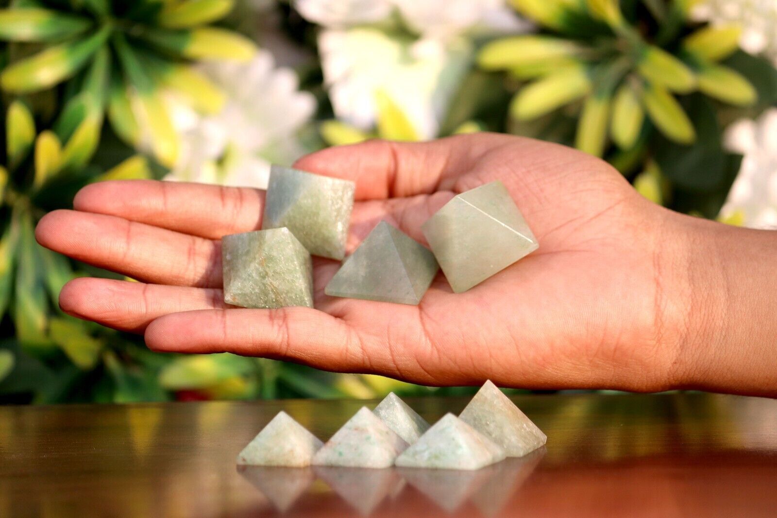 Natural carved pyramid crystal Green Aventurine chakra reiki healing gemstone 30mm Description: Material: Natural Green Aventurine Color:Green Size:20X27mm, 28g Quantity: 9 pc