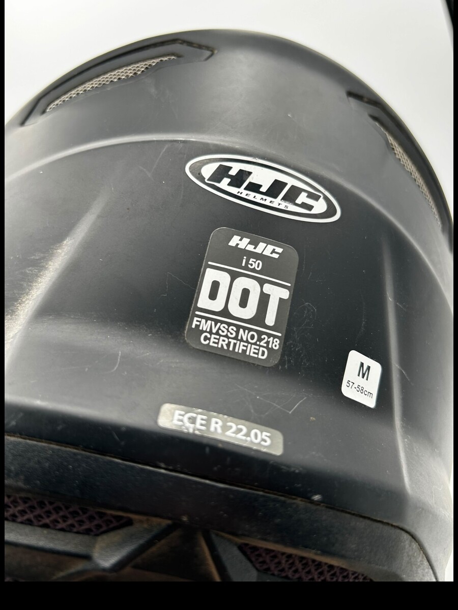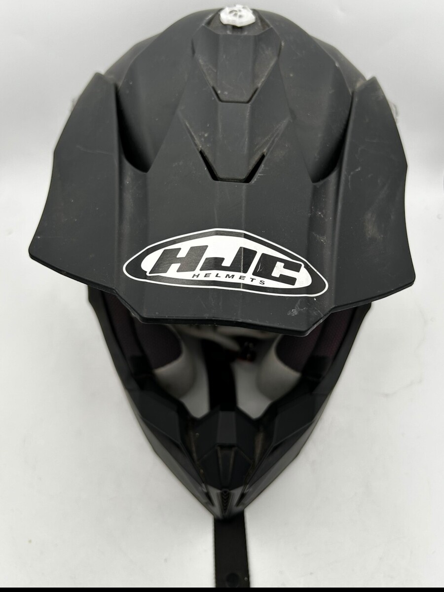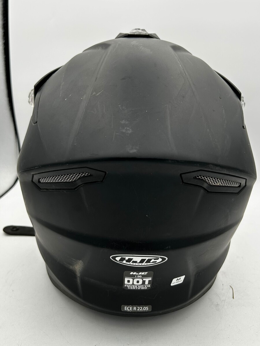 HJC Helmets i50 Poly Solid Off Road Black MEDIUM 57-58 CM (7 1/8" to 7 1/4") with obvious scratches but otherwise great condition HJC's new off-road helmet is designed to create ease and comfort for the rider in an aggressive and attractive design. A large, repositioned eye-port optimizes the view for downward visibility. Dual-position goggle band fitment adjusts for the rider's comfort and preference. The extended visor blocks sunlight and protects the rider from debris and is flexible to allow the material to bend instead of break. The tool-less, changeable mouth vent allows for easy cleaning. ""ACS"" Advanced Channeling Ventilation system allows full front to back airflow to flush heat and humidity up and out, while the SuperCool Interior keeps the rider cool and fresh with moisture-wicking fabric that is removable and washable. The I 50 features SLID (Sliding Layer Impact Distribution), HJC's impact distribution technology. Advanced Polycarbonate Compact Shell: Lightweight, superior fit and comfort using advanced CAD technology."ACS" Advanced Channeling Ventilation System: Full front-to-back airflow flushes heat and humidity up and out with 13 vent holes to keep riders cool and comfortable.SuperCool Moisture-wicking Interior: Removable and washable.Large Eye Port: For maximum visibility and superior goggle fit.Aggressive and Attractive Design.Functionally Designed Visor: Protects riders from branches and obstacles.Changeable Mouth Vent: Tool-less, changeable mouth vent for easy cleaning.D-ring with Retention Strap Quick-release and adjustable.DOT and ECE Approved.