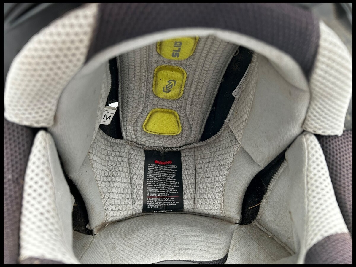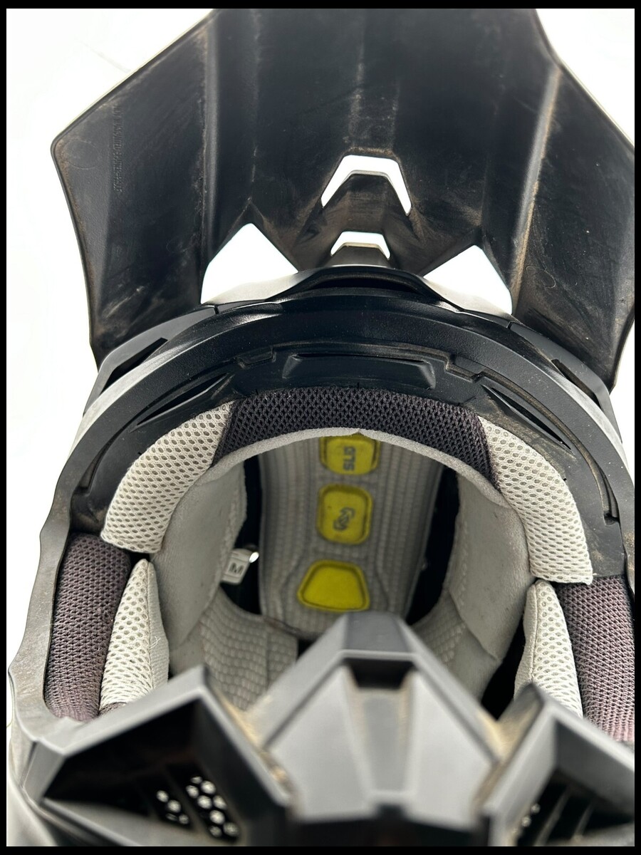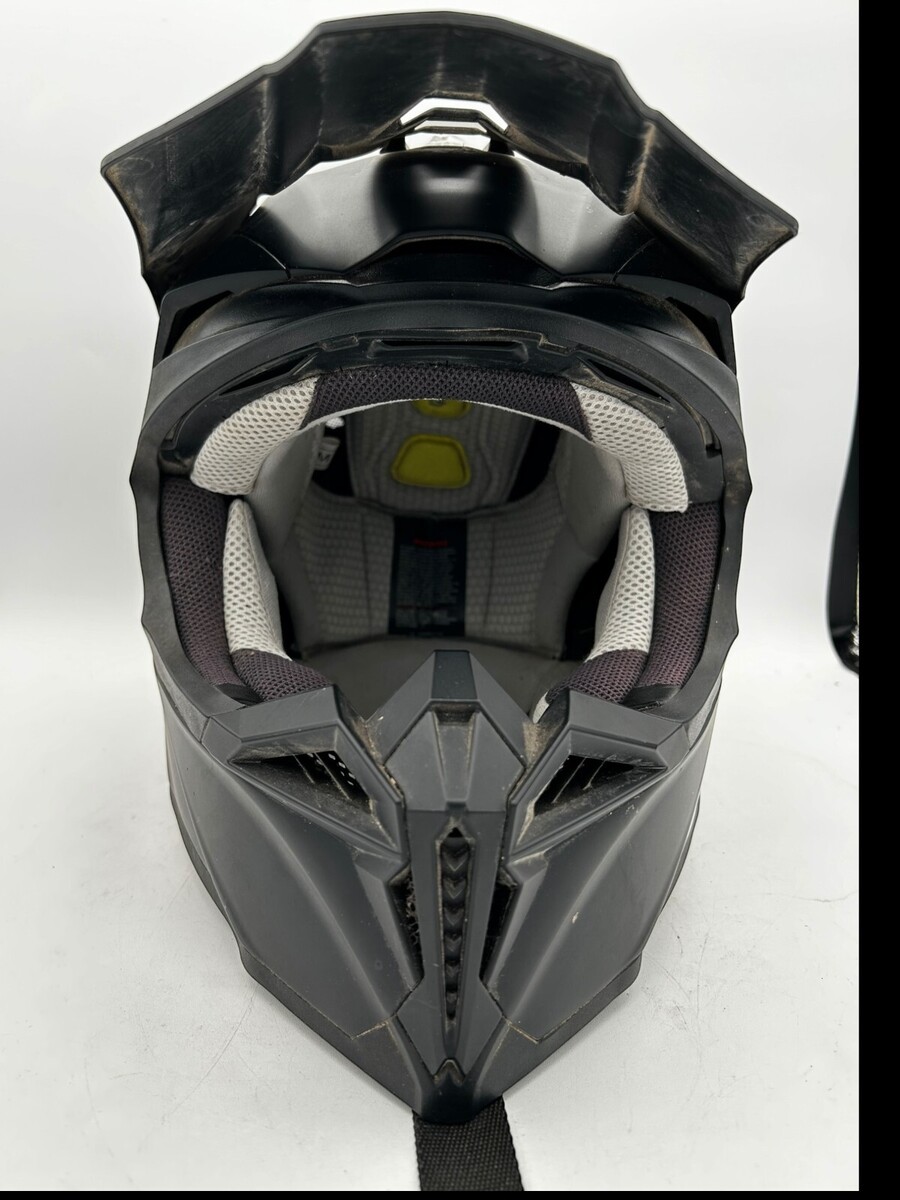 HJC Helmets i50 Poly Solid Off Road Black MEDIUM 57-58 CM (7 1/8" to 7 1/4") with obvious scratches but otherwise great condition HJC's new off-road helmet is designed to create ease and comfort for the rider in an aggressive and attractive design. A large, repositioned eye-port optimizes the view for downward visibility. Dual-position goggle band fitment adjusts for the rider's comfort and preference. The extended visor blocks sunlight and protects the rider from debris and is flexible to allow the material to bend instead of break. The tool-less, changeable mouth vent allows for easy cleaning. ""ACS"" Advanced Channeling Ventilation system allows full front to back airflow to flush heat and humidity up and out, while the SuperCool Interior keeps the rider cool and fresh with moisture-wicking fabric that is removable and washable. The I 50 features SLID (Sliding Layer Impact Distribution), HJC's impact distribution technology. Advanced Polycarbonate Compact Shell: Lightweight, superior fit and comfort using advanced CAD technology."ACS" Advanced Channeling Ventilation System: Full front-to-back airflow flushes heat and humidity up and out with 13 vent holes to keep riders cool and comfortable.SuperCool Moisture-wicking Interior: Removable and washable.Large Eye Port: For maximum visibility and superior goggle fit.Aggressive and Attractive Design.Functionally Designed Visor: Protects riders from branches and obstacles.Changeable Mouth Vent: Tool-less, changeable mouth vent for easy cleaning.D-ring with Retention Strap Quick-release and adjustable.DOT and ECE Approved.