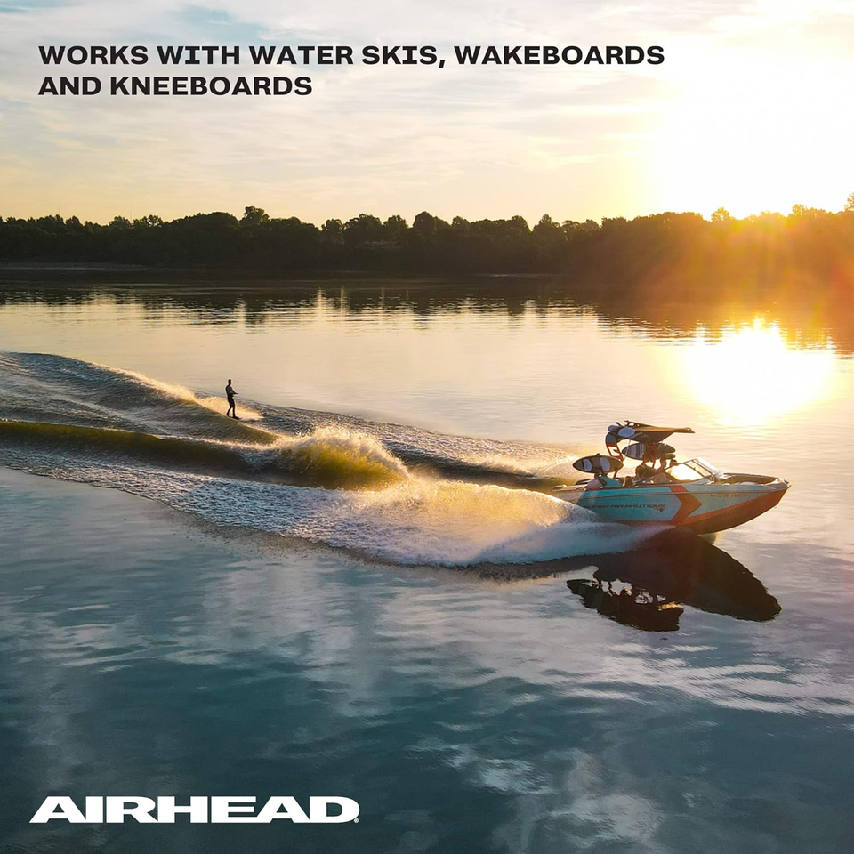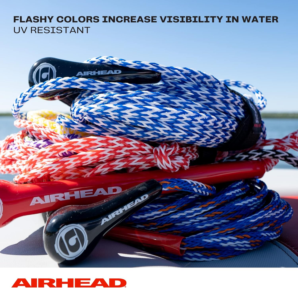Need a water ski rope for long days and minimal muscle discomfort? The Airhead 3 Section Radius Handle Water Ski Rope features a 17 degree, 13-inch radius aluminum core handle, which allows a more natural grip. Plus, the soft patterned EVA grip wraps the handle and full-length finger guards provide a solid, unmistakable hold. This 16-strand, UV-treated three-section water ski rope has multiple options for use. Take it skiing, wakeboarding, or kneeboarding at 75, 60, or 45 feet. Each section is a different bright, stunning color for optimum visibility. The encased crossover yoke protects the rope from high abrasion wear areas. A Rope Keeper is included for tangle-free storage.