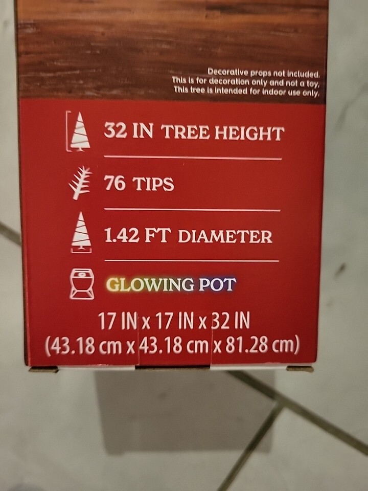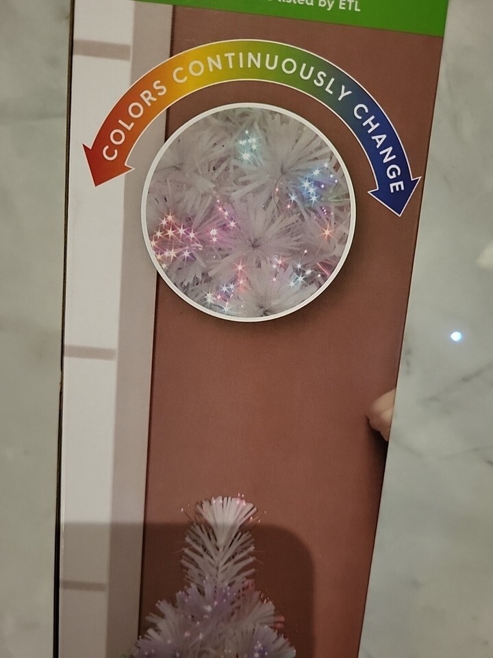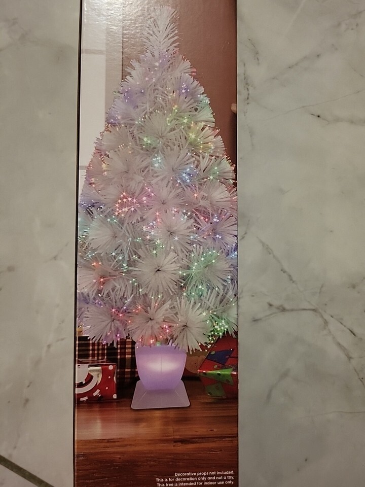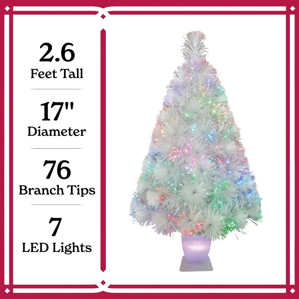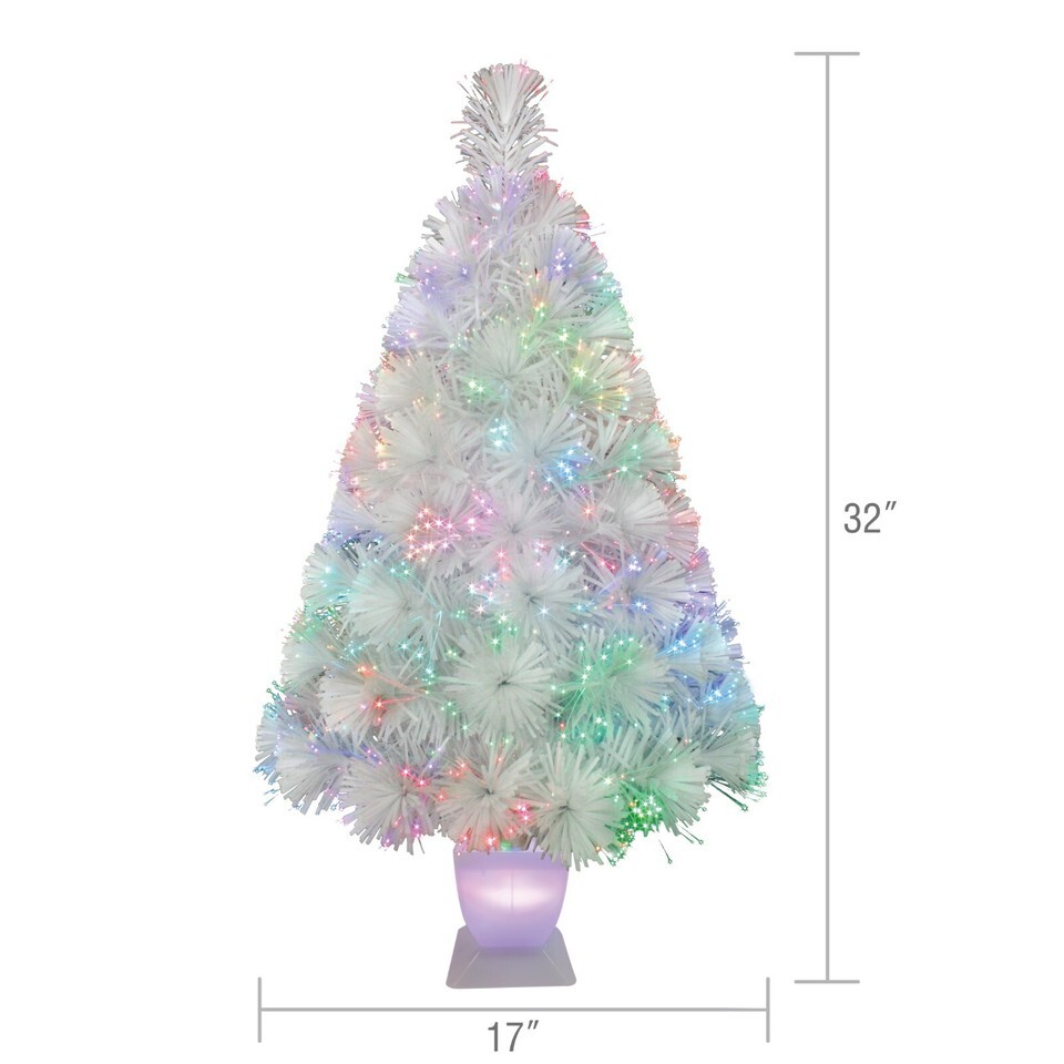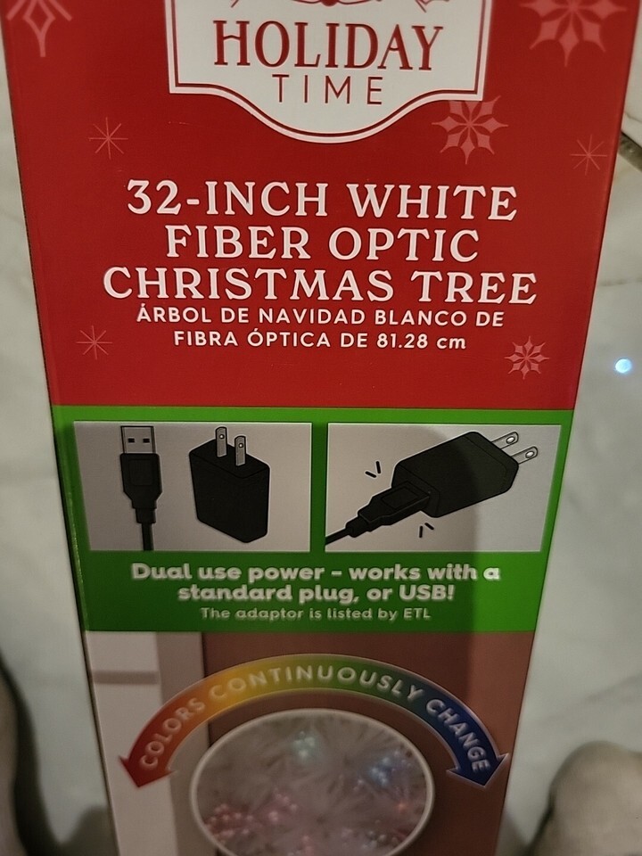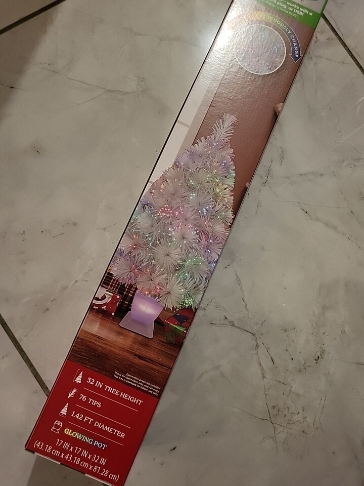 Brand New in the Box! 32-Inch Prelit White Fiber Optic Christmas Tree, by Holiday Time FEATURES: ~ Holiday Time 32-Inch Prelit White Fiber Optic Christmas Tree 32? spruce artificial Christmas tree with 76 branch tips for a natural look Christmas tree uses fiber optic technology to change colors, ensuring low power consumption during operation LED lit fiber optics continuously change colors for a festive holiday look Fiber optic lights are integrated with tree branches to beautifully illuminate your light weight ornaments and trimmings Assembly required; instructions included Powered with a standard plug or a USB connection for effortless use Easy set-up, break down, and storage Color-changing glowing pot included GREAT ITEM AT A GREAT PRICE!!