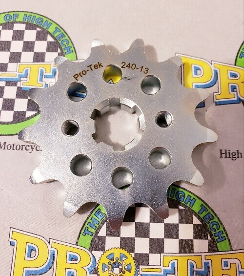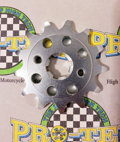 Pro-tek front sprockets are also completely CNC machined to exact tolerances from 4140 nickel-chromoly steel resulting in a quality product. None of the Pro-tek front sprockets are gear hobbed, but are lightened with drilled holes to save on rotating mass. Every lb of rotating mass equates to a 4 lb weight reduction. The sprockets are then case hardened to Rc 58-60 and finished with a zinc plating for added durability and protection from corrosion. Made in the USA, normally retail for $29.95. This is for a 520 Pitch front sprocket 13 or 14 tooth.