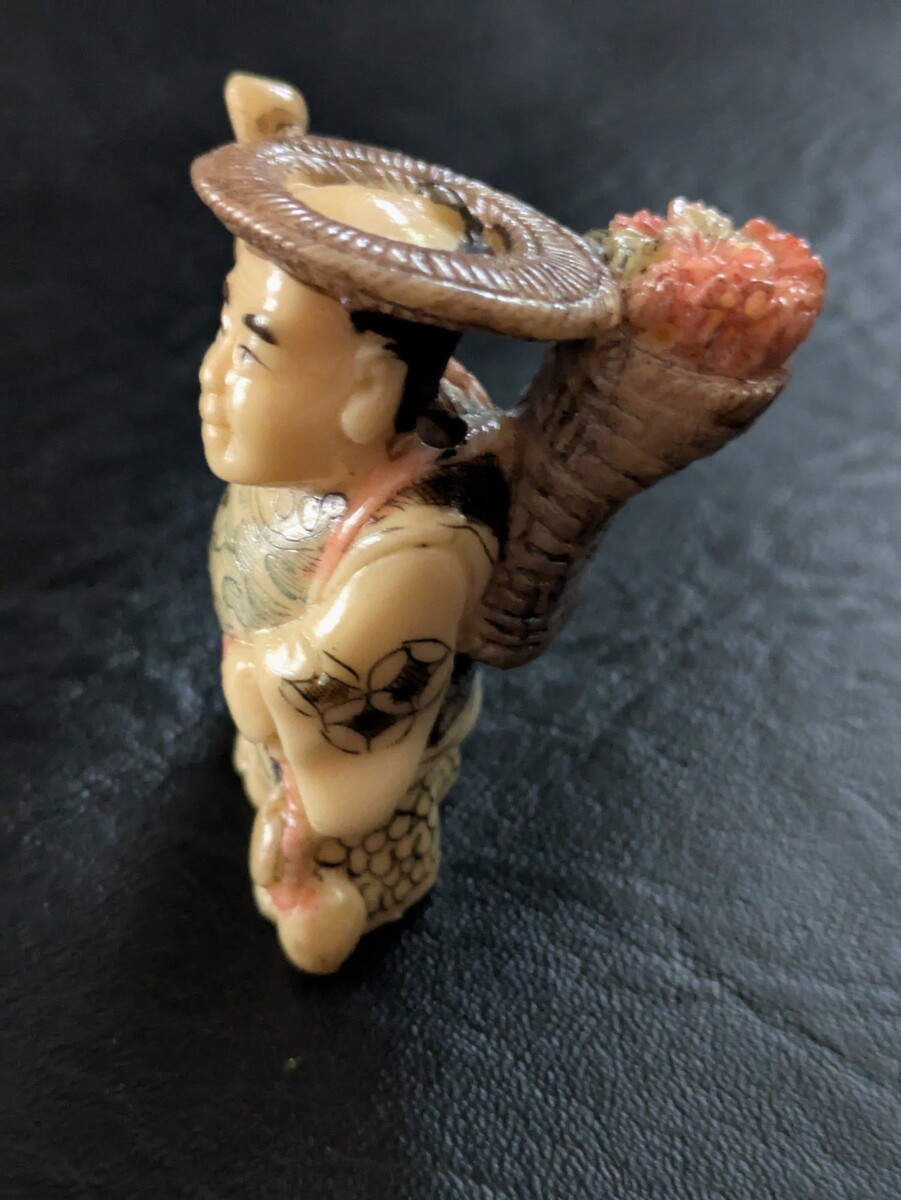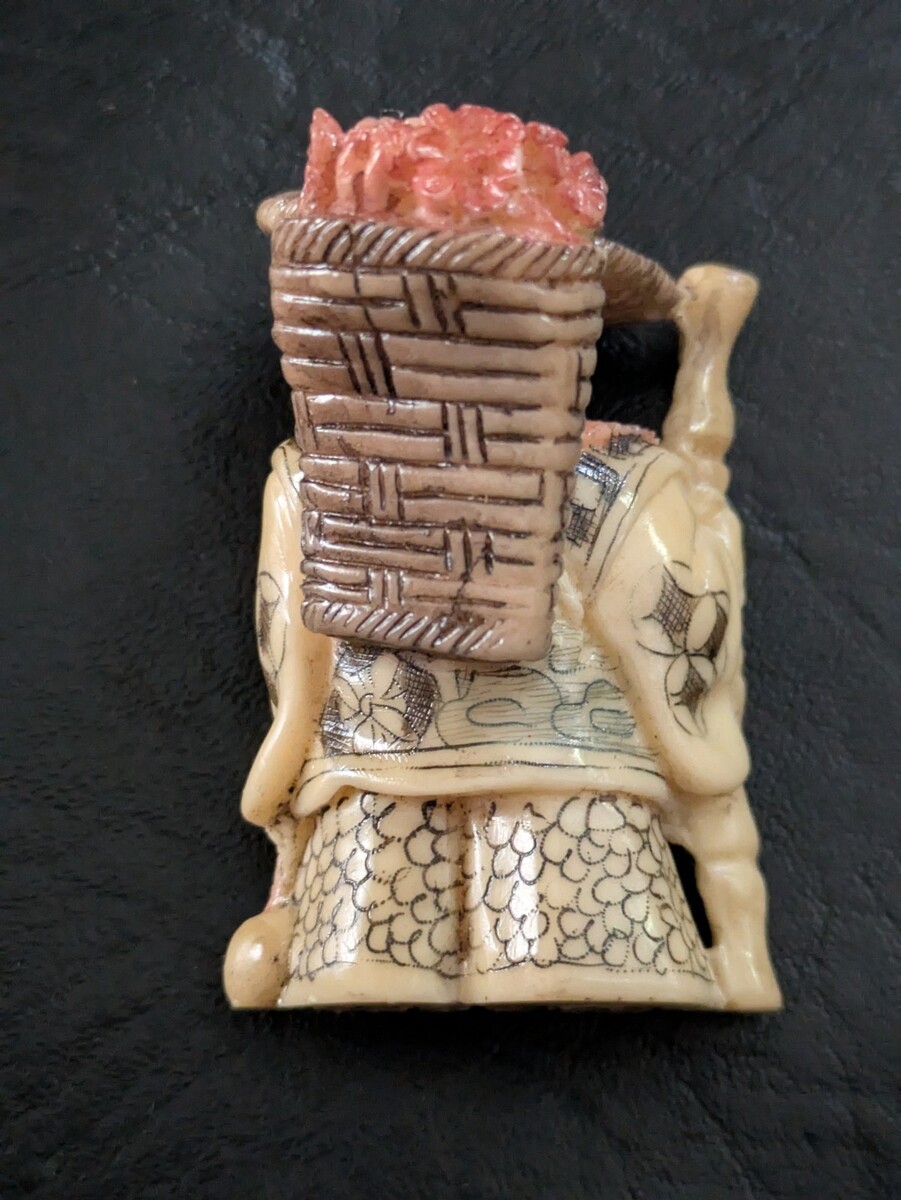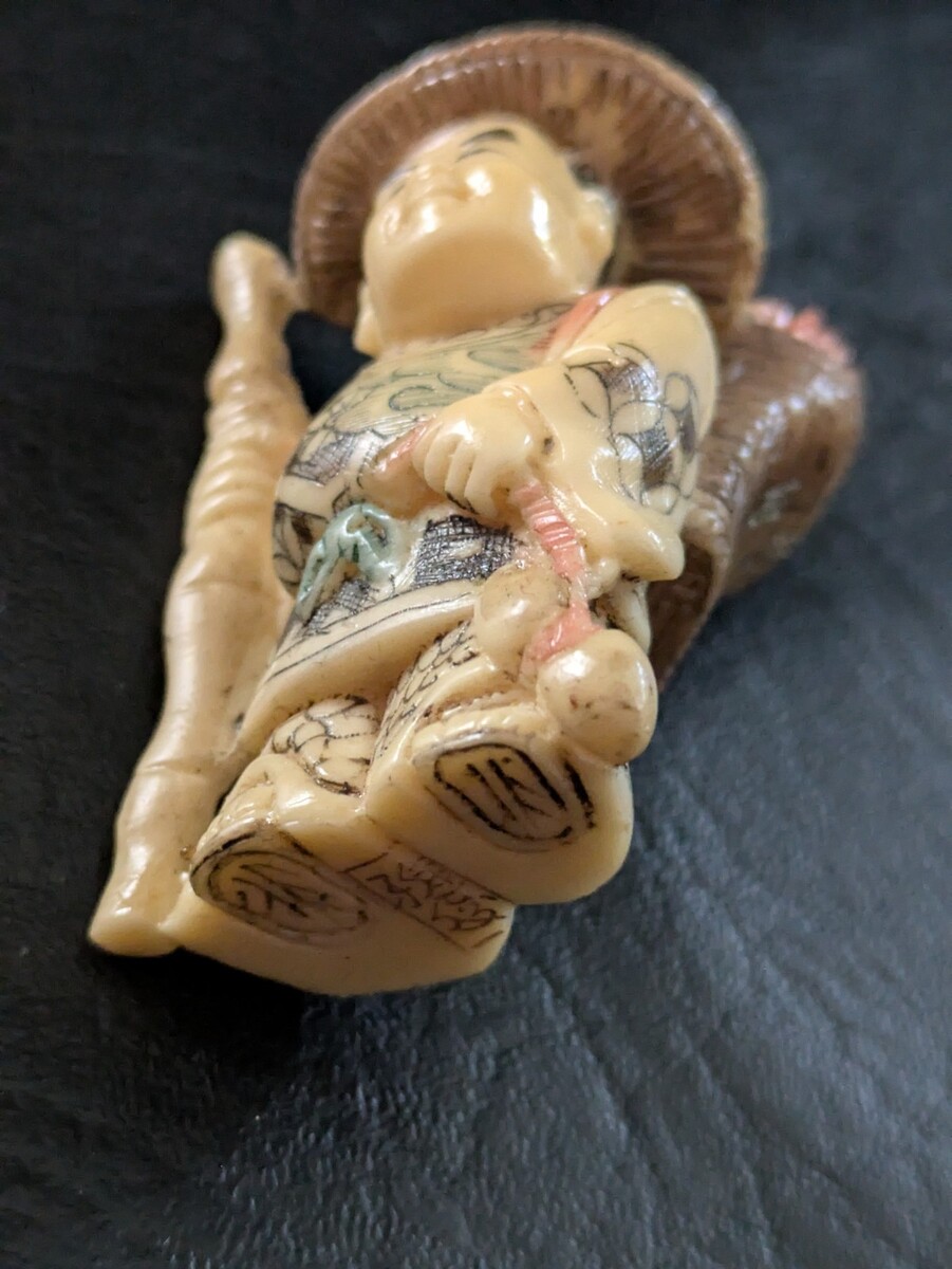 - IN Piedi Uomo Bastone Cesto Casa Cappello Netsuke Giapponese Dipinto Intagliati