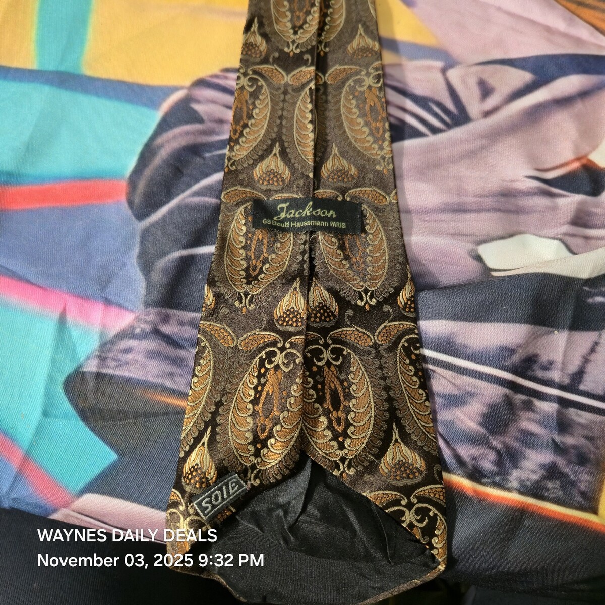 Vintage Jackson Paris silk tie with an intricate brown and gold leaf-and-scroll motif. Crafted from 100% silk, this design captures French luxury and sophistication.