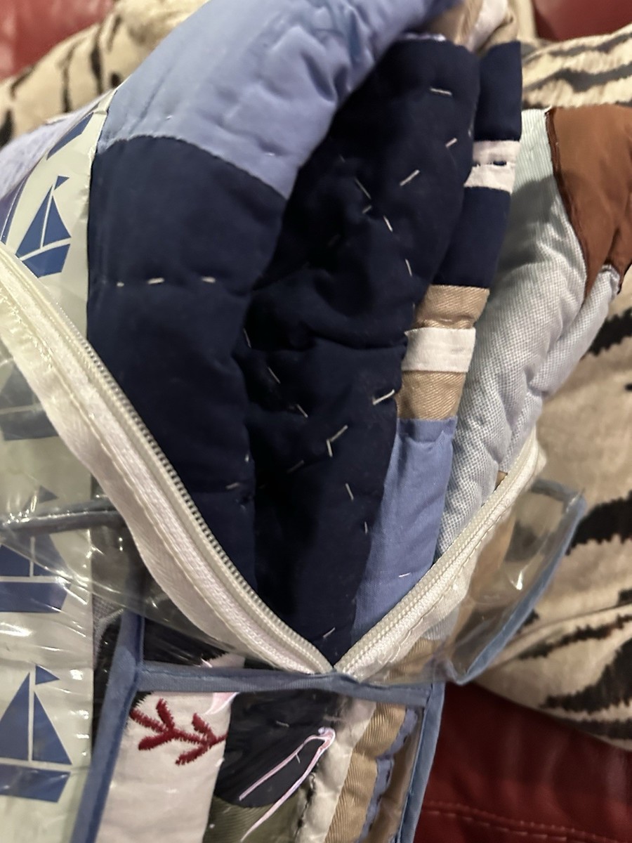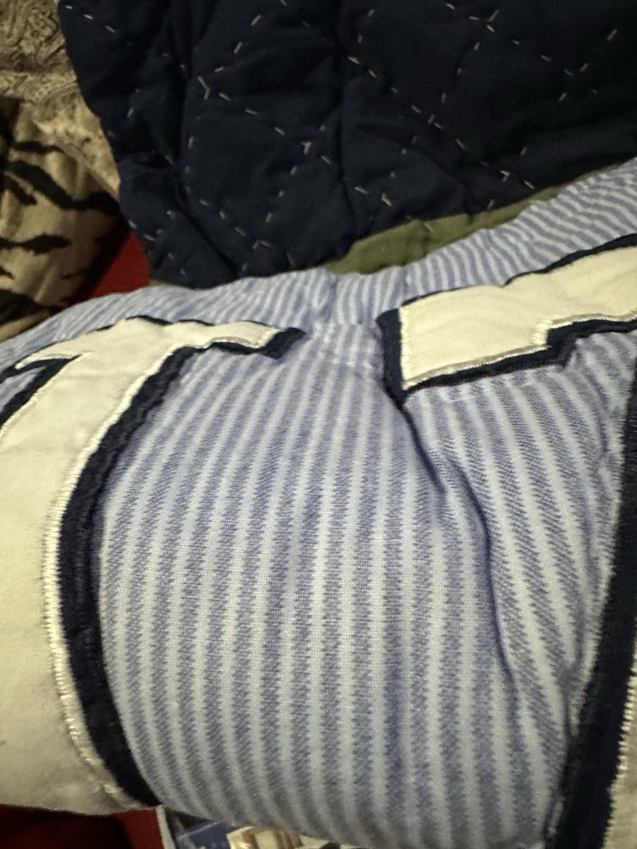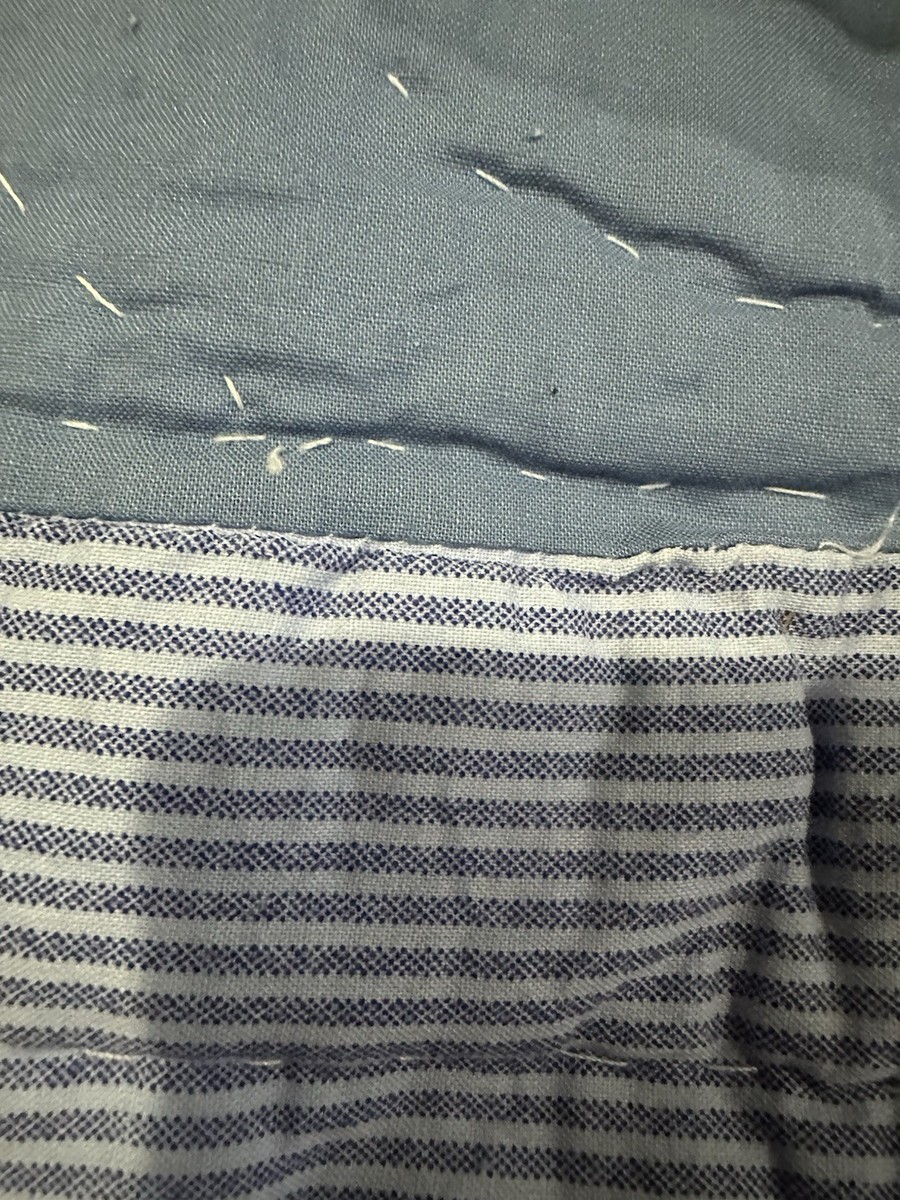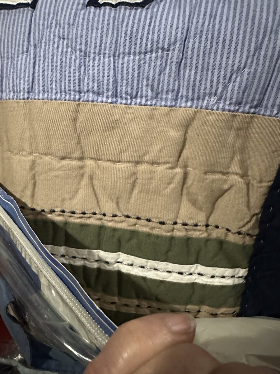 Reversible to pin stripe with white stitching of the front. Back looks like the front without the colors. Leave it to pottery barn.