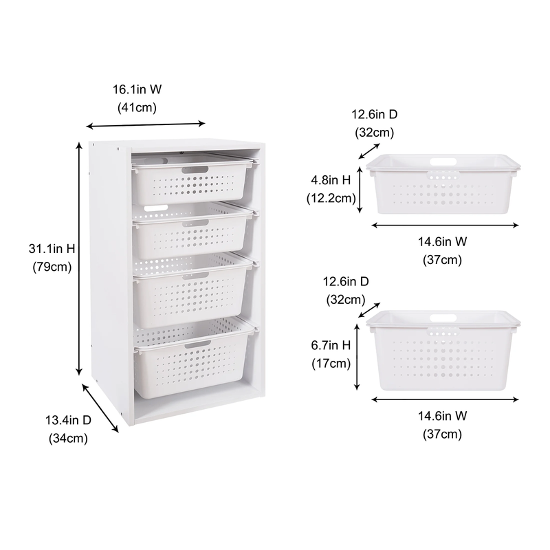 Removable toy storage bins for playtime and easy clean up Product dimensions: 16.1in W x 13.4in D x 31.1in H, Small bin: 14.6W x 12.6D x 4.8H,Big bin: 14.6W x 12.6D x 6.7H Assembled product weight: 27.55lbs Sturdy engineered wood construction frame with plastic rails,and 4 plastic bins Easy assembly, plastic rails pre-assembled Wall anchors provides additional safety support Great for keeping children's toys, books, shoes, games, arts, crafts and other items stored away and easy to find Makes an ideal storage unit any kid's room, play room, guest room, spare room, classroom, and more Packing dimensions: 15.9in W x 12.6in D x 36.0in H Packing weight: 33.29lbs