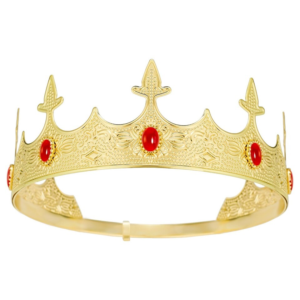 ROYAL GOLDEN KING CROWN: Elegant men?s crown headband with antique gold finish and ruby-style rhinestones. Adds instant charm and a regal look to costumes, parties, and themed events.