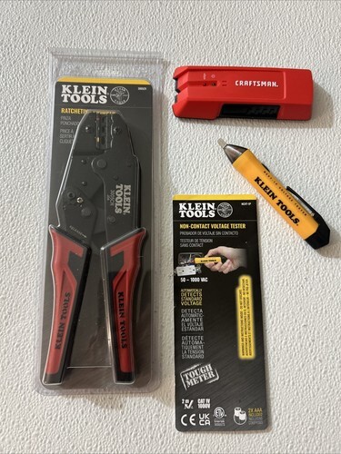 A new Klein Tools ratcheting crimper, for insulated connectors. Also a Klein Tools non-contact voltage tester, and a Craftsman stud finder (no packaging with the last two items, but are like new.) No batteries included. L-11/25-652-Al-WLTub#1-Eo