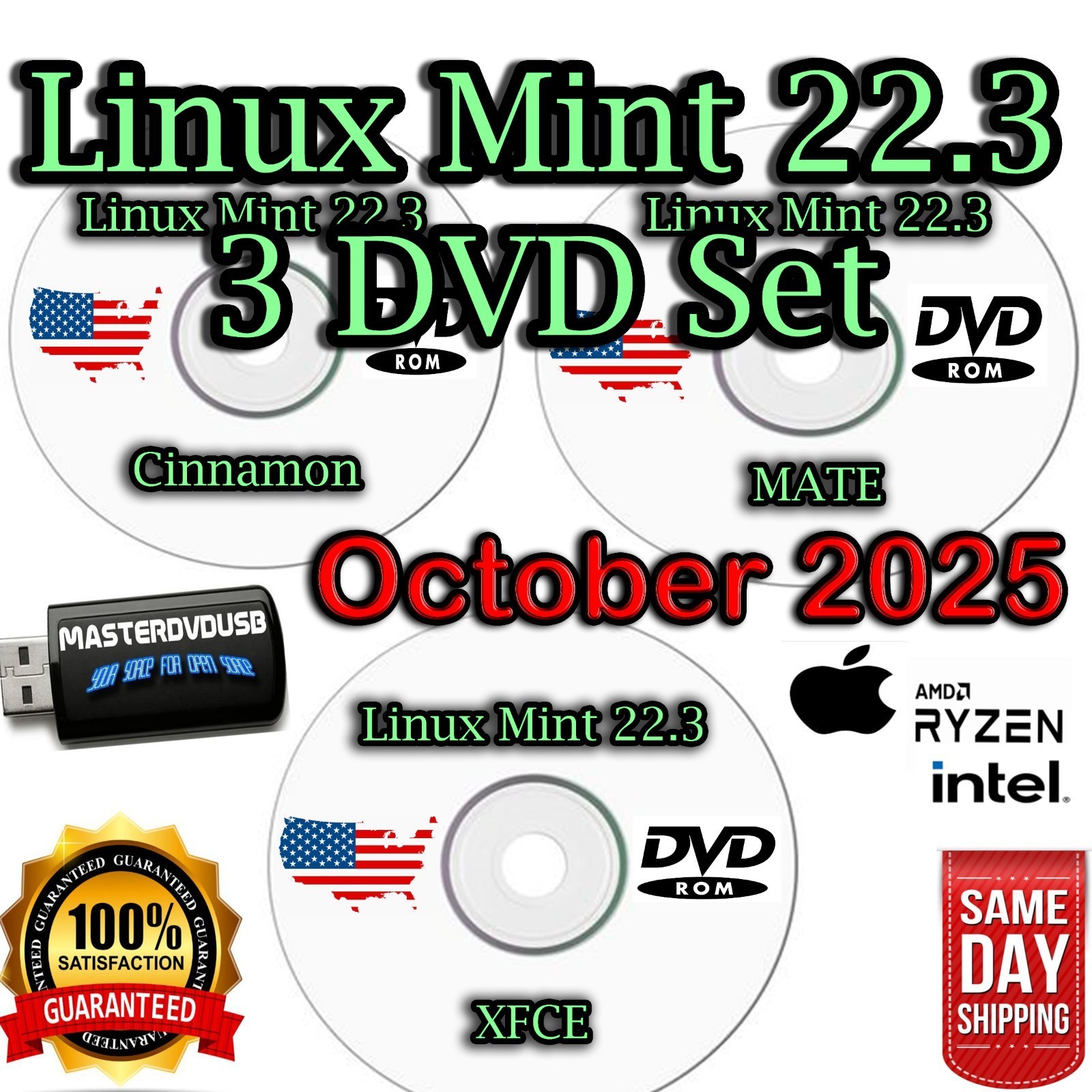 ? Linux Mint 22.3 Bootable 3-DVD Set ? Cinnamon, MATE XFCE Latest Version Same-Day Shipping from California MASTERDVDUSB ?