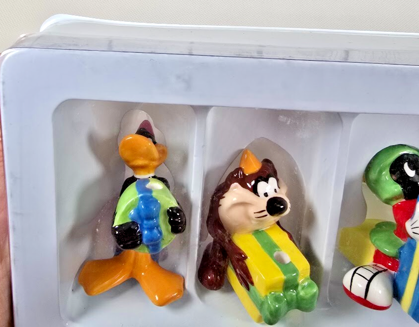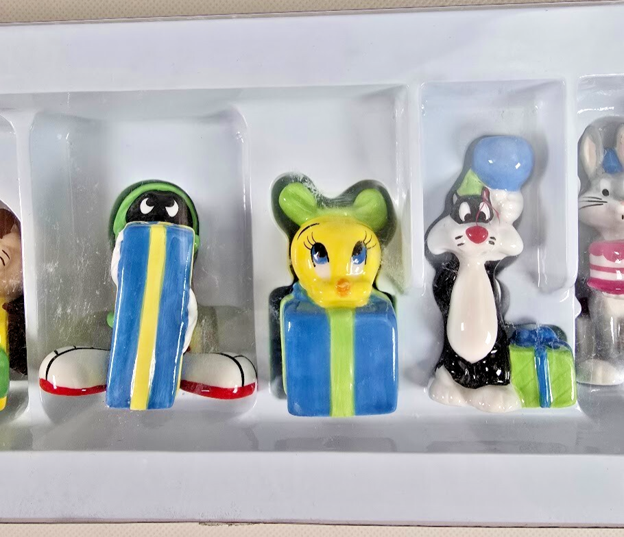 Celebrate with classic cartoon fun using this vintage set of 6 ceramic Looney Tunes birthday candle holders. Featuring beloved characters like Bugs Bunny, Tweety, and Daffy Duck, each holder doubles as a whimsical cake topper?boxed and ready to add retro charm to any party. ? Set of 6 ceramic candle holders with Looney Tunes characters ? Includes original box with vintage Warner Bros branding ? Doubles as fun cake toppers or collectible party decor ? Perfect for birthdays, collectors, or nostalgic celebrations