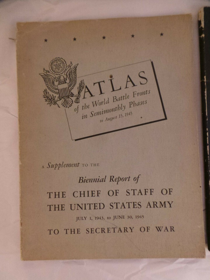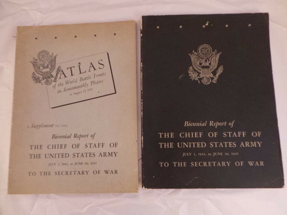 These are incredible records of WWII from the Chief of Staff of the United States Army to the Secretary of War and the War Department. this is a lot of 2 "Biennial Reports of the Chief of Staff of the US Army to the Secretary of War" from July 1943 to June 1945.....and its Atlas Supplement for 1943-1945. Details of War with Germany and Japan; various battlefronts, maps, and alot more. (The War Department became the Defense Department in 1949 under Truman.) see photos for some of the content and index. Very good condition... spine rubbing; spine pieces missing at top; spine wear; some edge wear, small chips. I will ship via the US Post Office with delivery tracking. international first class. Thank you. Please see my other auctions for posters, books, magazines and gifts..