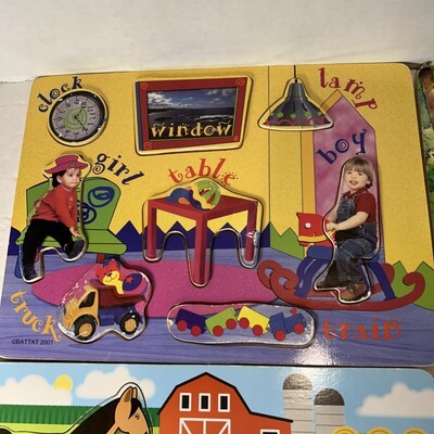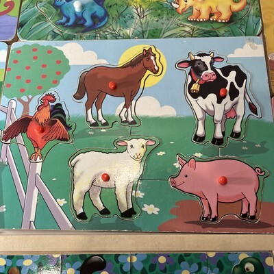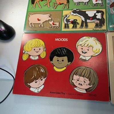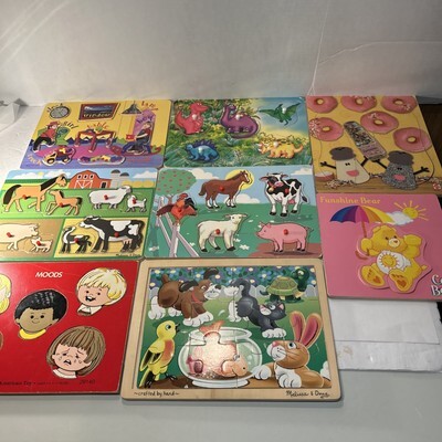 Mixed lot of 8 children?s puzzles featuring both wooden and cardboard styles. Includes branded puzzles from Melissa Doug, Mattel, Care Bears, Battat, and American Toy, along with unbranded animal-themed puzzles. Some are vintage from the 1980s?1990s (Care Bears, Mattel, American Toy), while others are more recent. All puzzles are complete as shown and display light wear from play and storage.