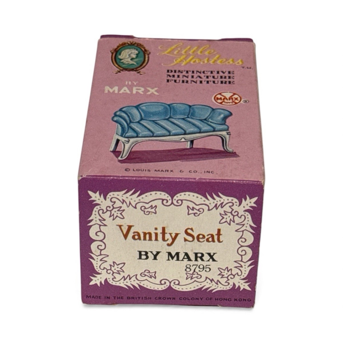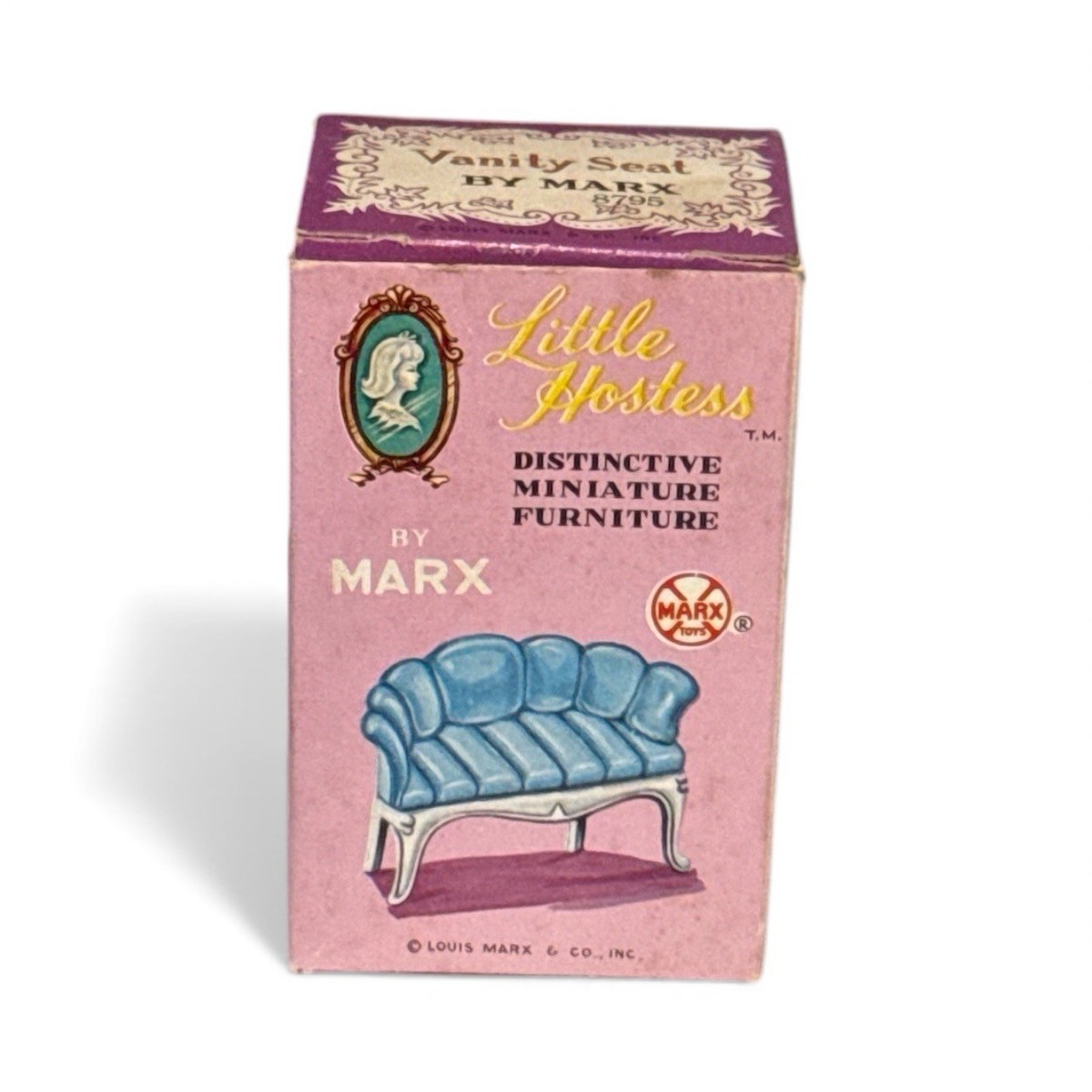 Louis Marx Co Little Hostess Aqua Vanity Seat (Hong Kong) Bench VTG HTF 8795 Comes with the original box. Little Hostess Collection from the 1960s, with boxes. See other listings for additional pieces from the collection. Please see photos. Measurements included. Please see our other items listed. We have other Collectable dollhouse, Collectable dolls and Vintage Christmas. IN DH3