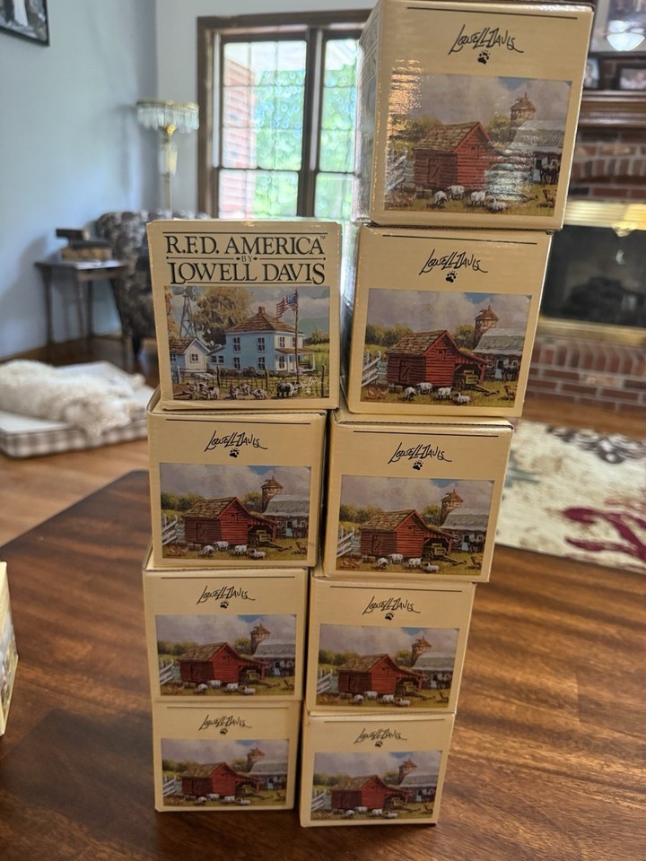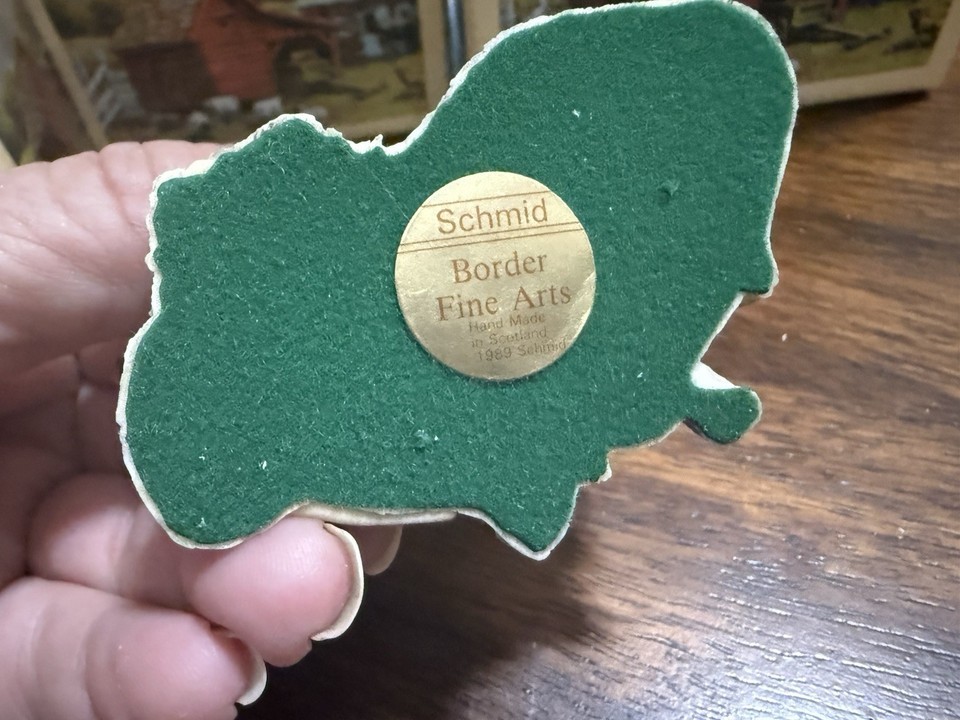 The Lowell Davis RFD America Gun Shy Dog Figurine from 1990 by Schmid is a charming collectible piece featuring the artist's signature Border Fine Arts brand. This multicolor figurine depicts a farm animal theme, specifically a dog, and is part of the RFD America collection. Made in the United Kingdom during the 1990s, this unboxed figurine is a wonderful addition to any collection of decorative sculptures and figurines for all occasions.