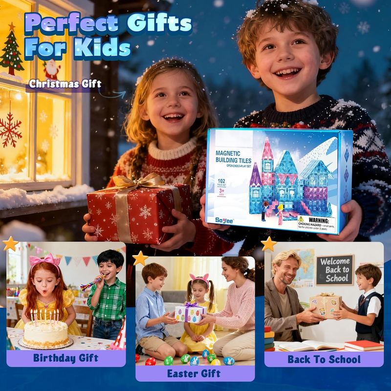 ?SURPRISING CHRISTMAS GIFTS? Don't hesitate! Any kid will be fascinated by diamond magnetic tiles. A great everyday gift for boys or girls who deserve a treat. Reward kids with a fun present that entertains them for hours and teaches them construction and creativity skills. Give the magnetic tiles kit to girls or boys as a Christmas holiday gift to kids ages 3 and up