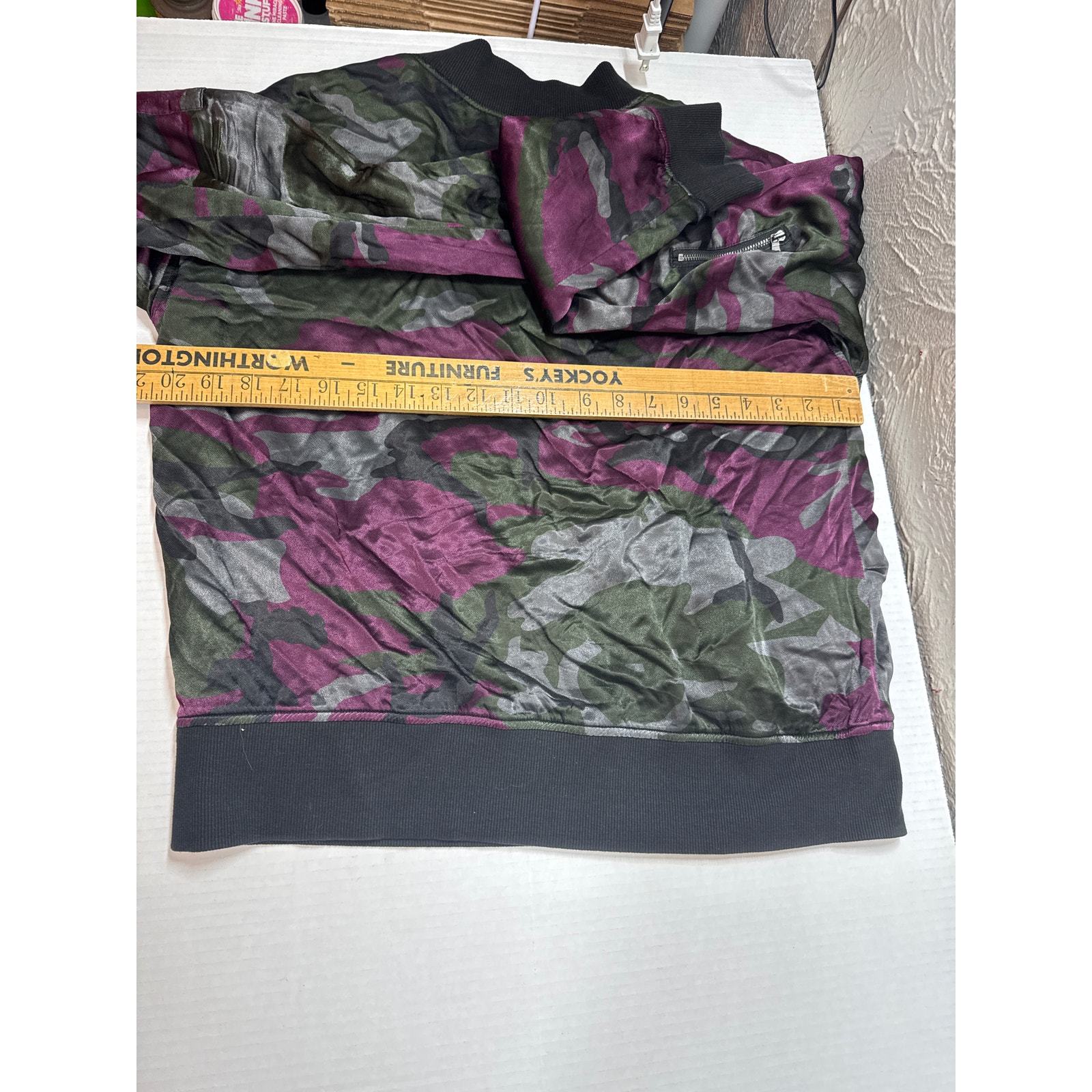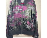 - Marrakech Anthropologie Bomber Jacket Camo Purple Green Black Satin Size Medium