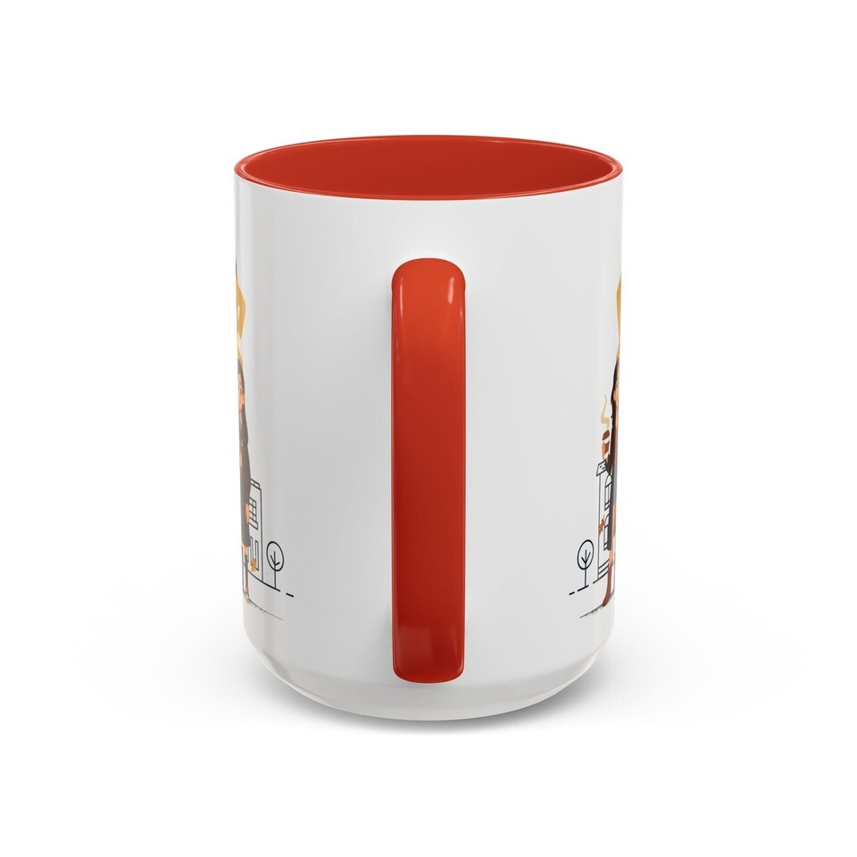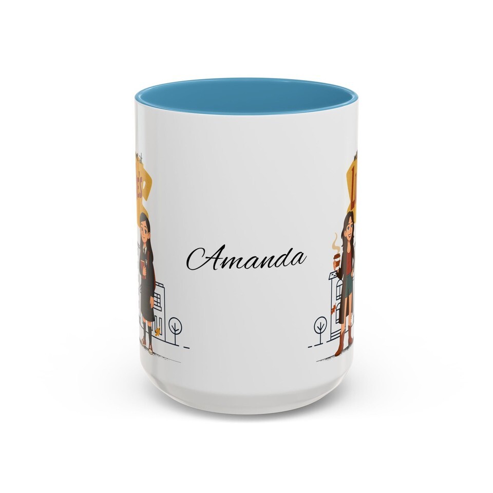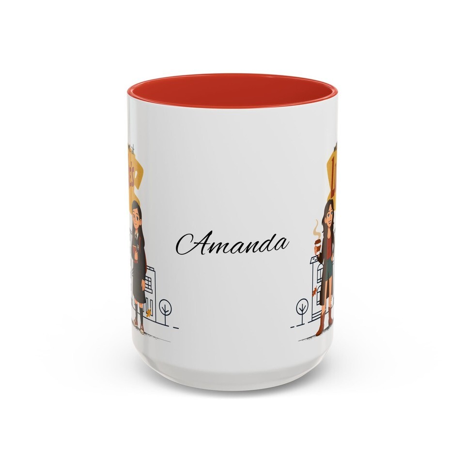 This glossy ceramic mug brings a little neighborhood warmth to morning routines. The colored interior and handle create a lively contrast against the white exterior, while the illustrated scene and personalized name add a cozy, familiar touch ? like a friendly local cafe sign turned into your go-to cup. It feels like sitting on a bench outside your favorite coffee spot, paper cup swapped for something sturdier and more personal. Lightweight enough for everyday use, but bold enough to stand out on your desk or kitchen shelf. Use it for slow sips, late-night study sessions, or to mark a favorite meetup spot in your home rituals.