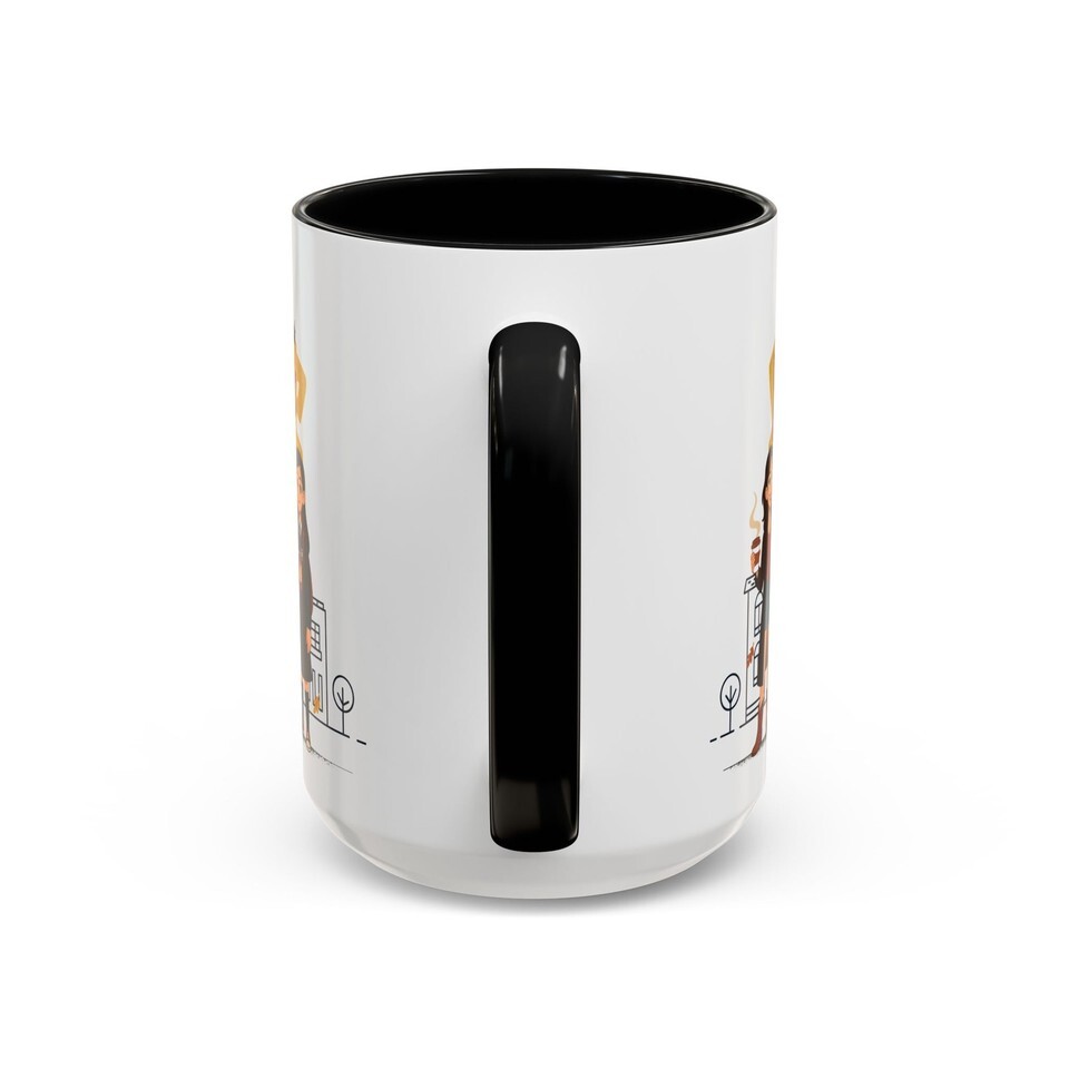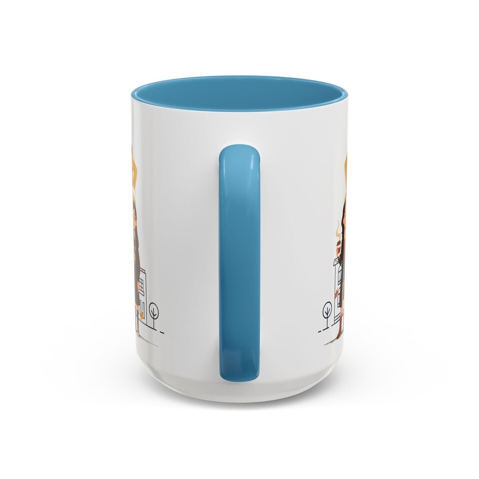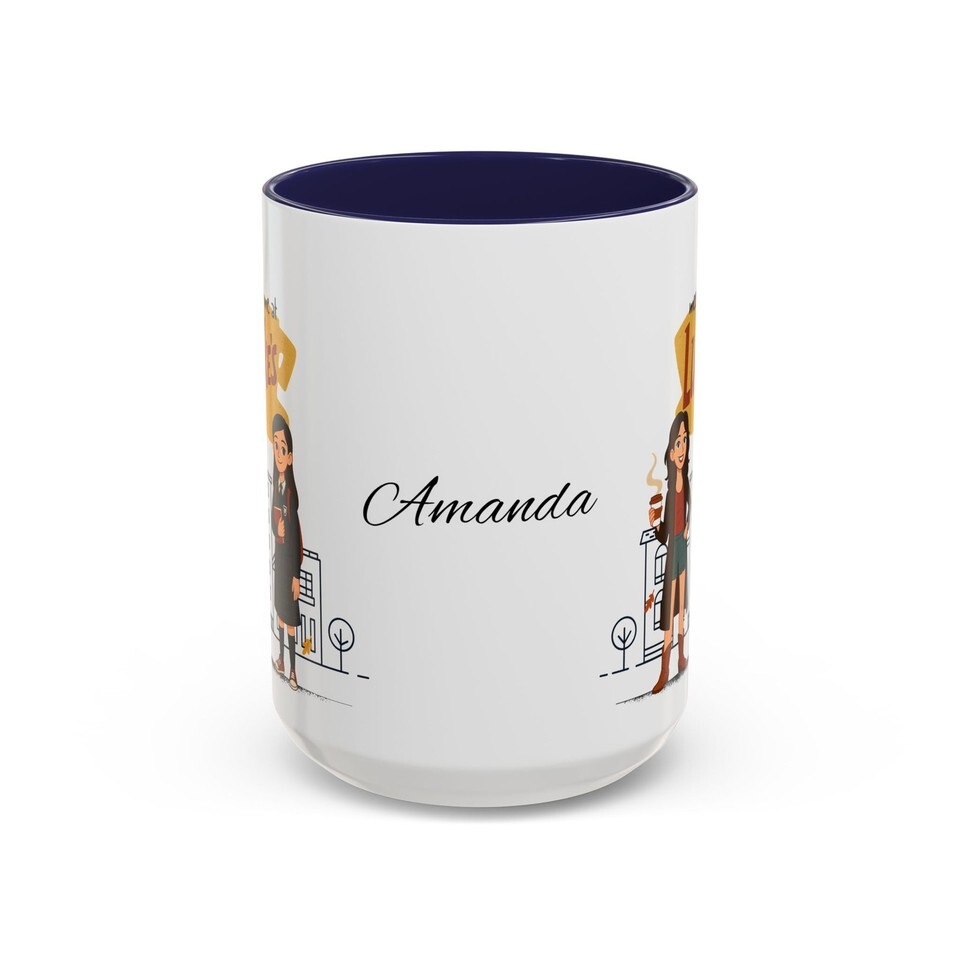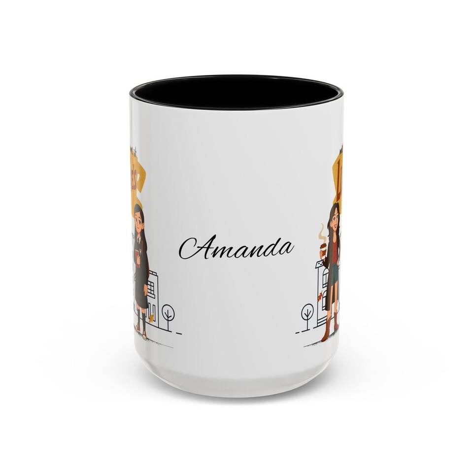 This glossy ceramic mug brings a little neighborhood warmth to morning routines. The colored interior and handle create a lively contrast against the white exterior, while the illustrated scene and personalized name add a cozy, familiar touch ? like a friendly local cafe sign turned into your go-to cup. It feels like sitting on a bench outside your favorite coffee spot, paper cup swapped for something sturdier and more personal. Lightweight enough for everyday use, but bold enough to stand out on your desk or kitchen shelf. Use it for slow sips, late-night study sessions, or to mark a favorite meetup spot in your home rituals.