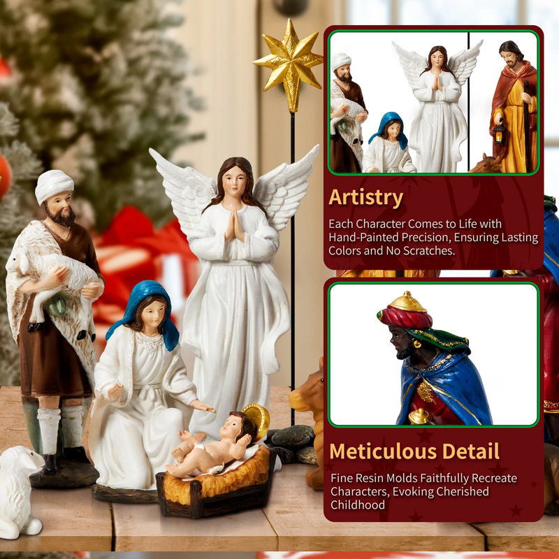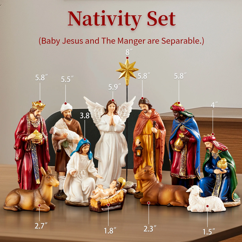 ??Hand-Painted?: It's not just a commodity, it's a work of art. This nativity sets are made of high quality hand-painted cast resin, which makes it more valuable for collection.