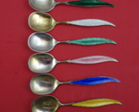 Norwegian sterling silver by Ohar Hval, Ice Cream Spoon set of 6, vermeil enameled feathered handle in green, white mint, pink, blue, yellow and dark green with chips, 5" . It is not monogrammed and is in excellent condition.