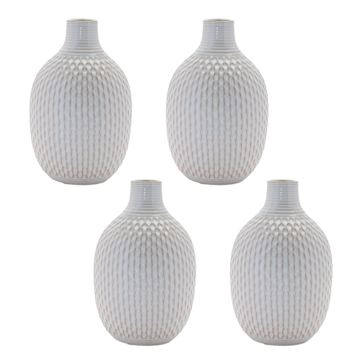 Soft Gray and Beige Tones with Glossy Finish: Adds subtle sophistication to your home Notched Texture with Bottle Neck Opening: Offers a stylish and tactile design Set of Four Matching Vases: Creates a harmonious and balanced display Suitable for indoor use only