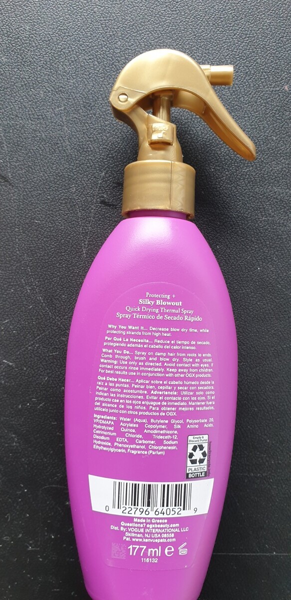OGX Protecting Silk Blowout Quick Drying Thermal Spray Hydrolyzed Silk 6 Fl Oz Description OGX Protecting Silk Blowout Quick Drying Thermal Spray Hydrolyzed Silk 6 Fl Oz. Product Detail ? Brand: OGX ? Formulation: Spray ? Volume: 6 Fl Oz ? Type: Hair Spray Please message me if you have any questions.