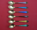 Sterling Silver Demitasse Spoon Set of 6, vermeil enameled in lavender, dark blue, turquoise, red, yellow and green 3 3/4" in the pattern Odel by Nils Hansen (Norway). It is not monogrammed and is in excellent condition.