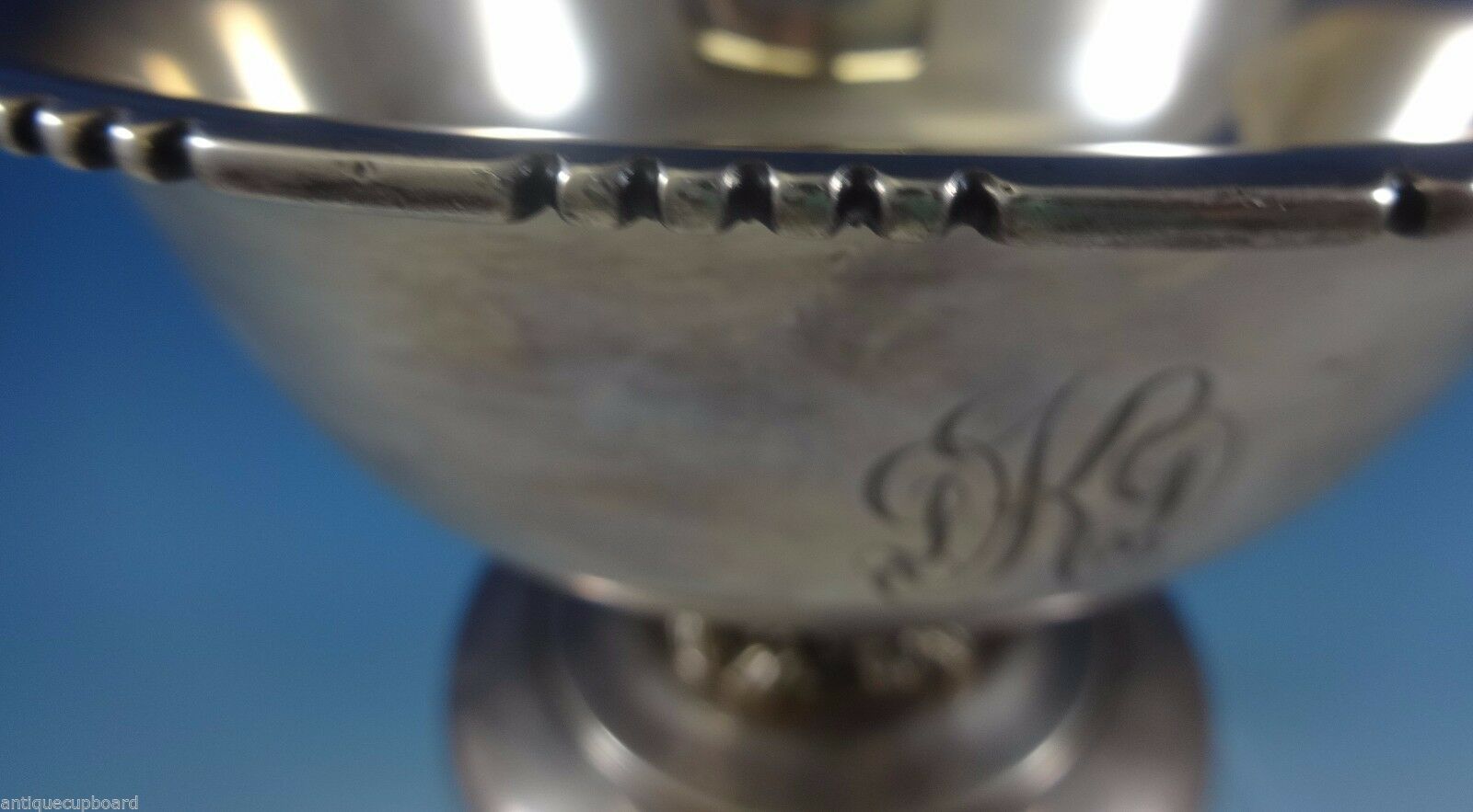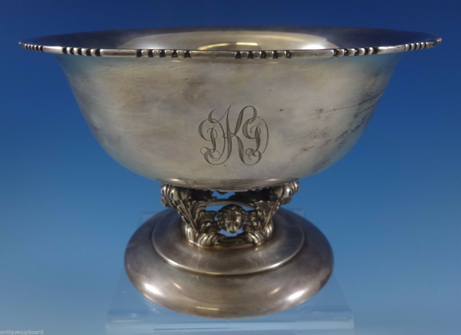 This exquisite sterling silver centerpiece bowl was made by Quaker Silver Co. of Massachusetts circa 1926-59, and then became part of Gorham. The bowl has a pedestal base with acanthus leaves and 3-D lion's head. It has a "DKD" monogram, and it measures 5 3/8" tall, 8 1/4" in diameter, and it weighs 23.11 ozt. It is in excellent condition.