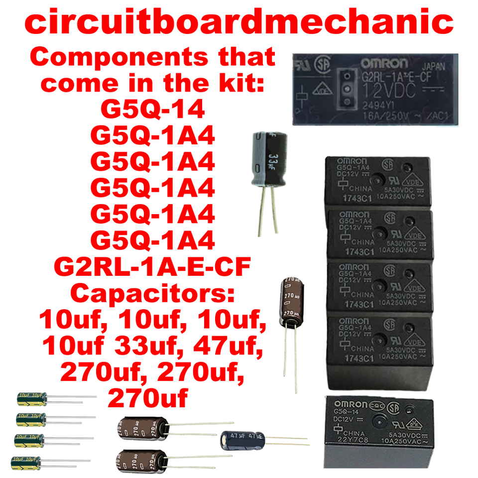 Repair Kit WPW10310240 12920717SP W10310240 Whirlpool Control Board Repair Kit Relays that come in the kit: G5Q-1A4, G5Q-1A4, G5Q-1A4, G5Q-1A4, G5Q-14, G2RL-1A-E-CF, Capacitors: 10uf, 10uf, 10uf, 10uf, 33uf, 47uf, 270uf, 270uf, 270uf Comes with 6 relay components that repair 99% of all control boards. You must know how to solder with a soldering iron and you must know the correct orientation to install the parts. Capacitors and resistors only go one direction so don't install them backwards b/c they will not work.504502550