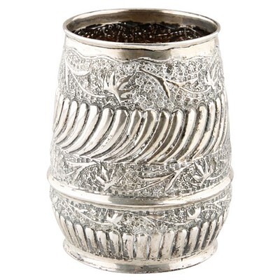 REPOUSSE SILVER WATER PITCHER 4 CUPS WEIGHT: 1.97 LBS SIZE: CUPS 3.5" H X 2.25" DIAMETER PITCHER 6.5" H X 3 5/8 DIAMETER
