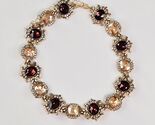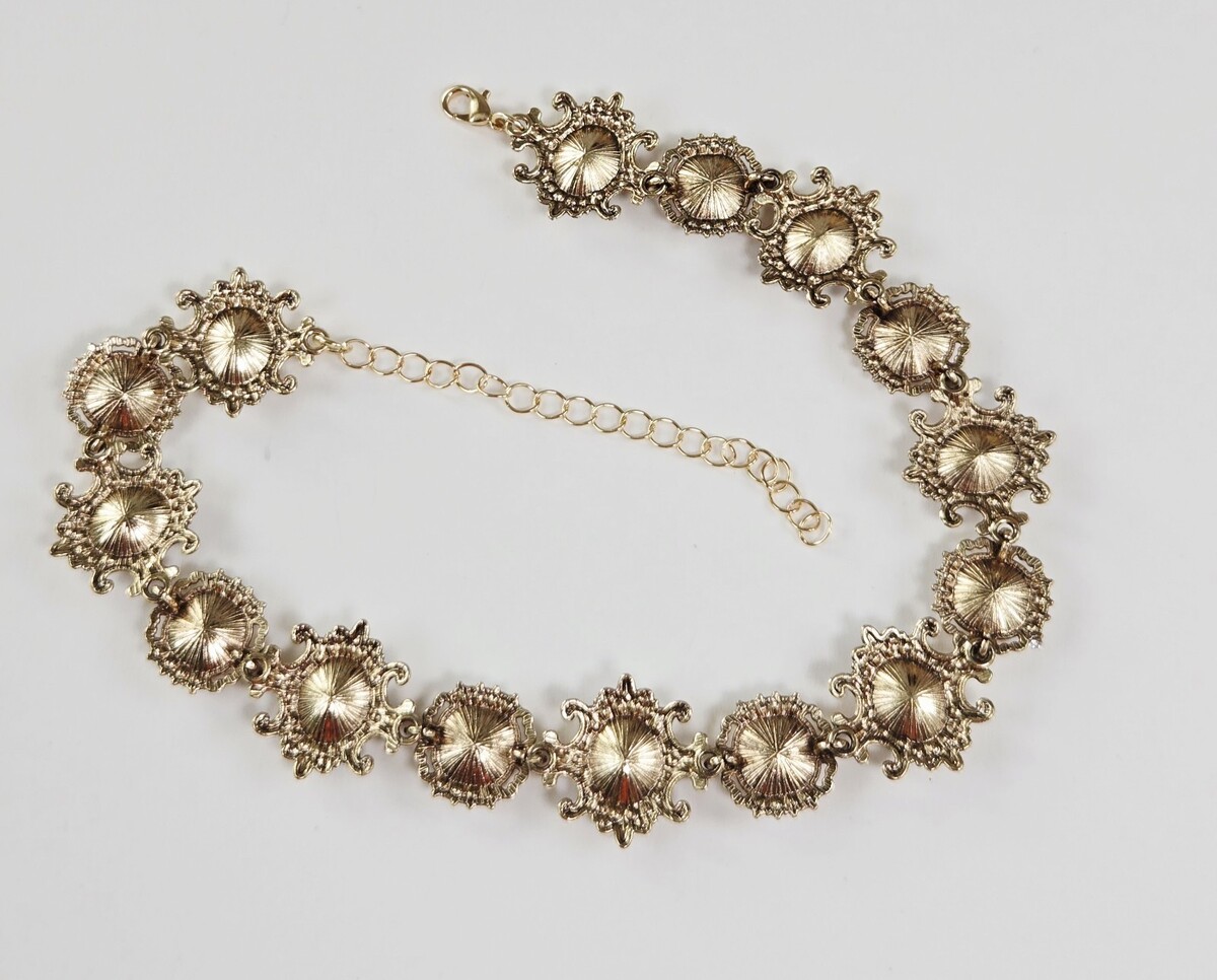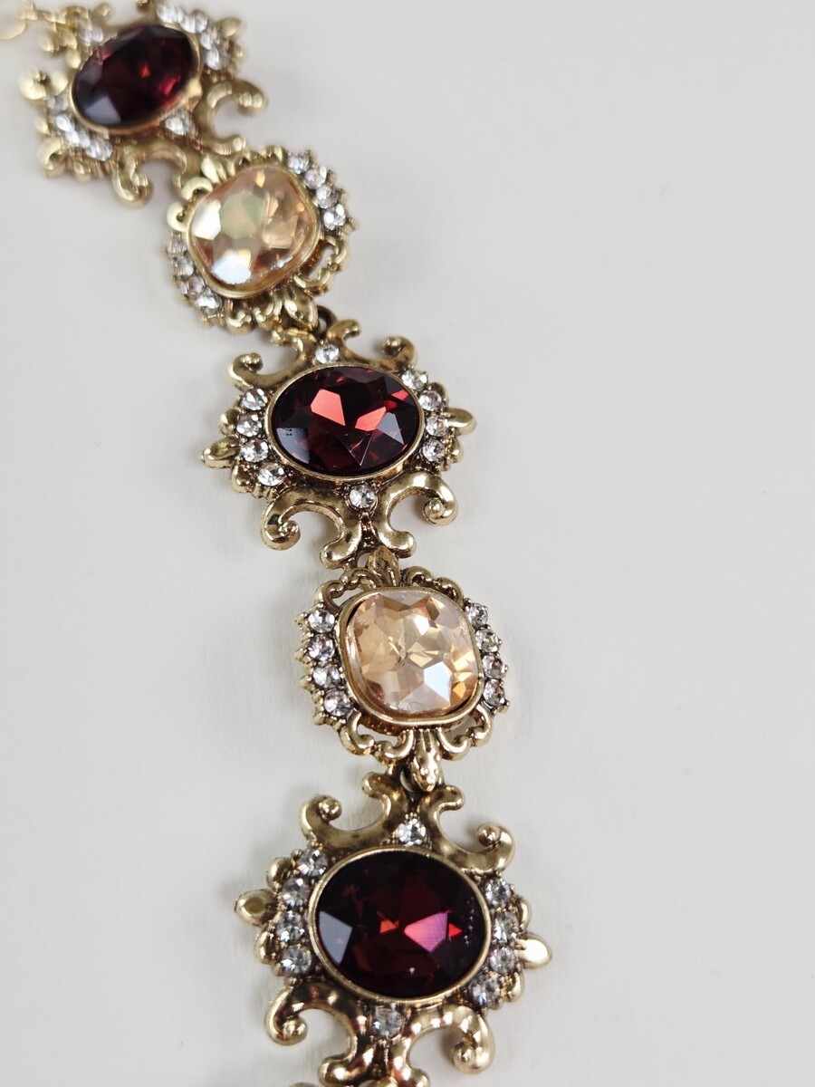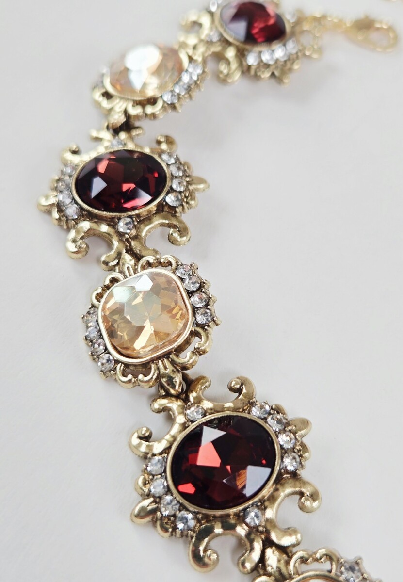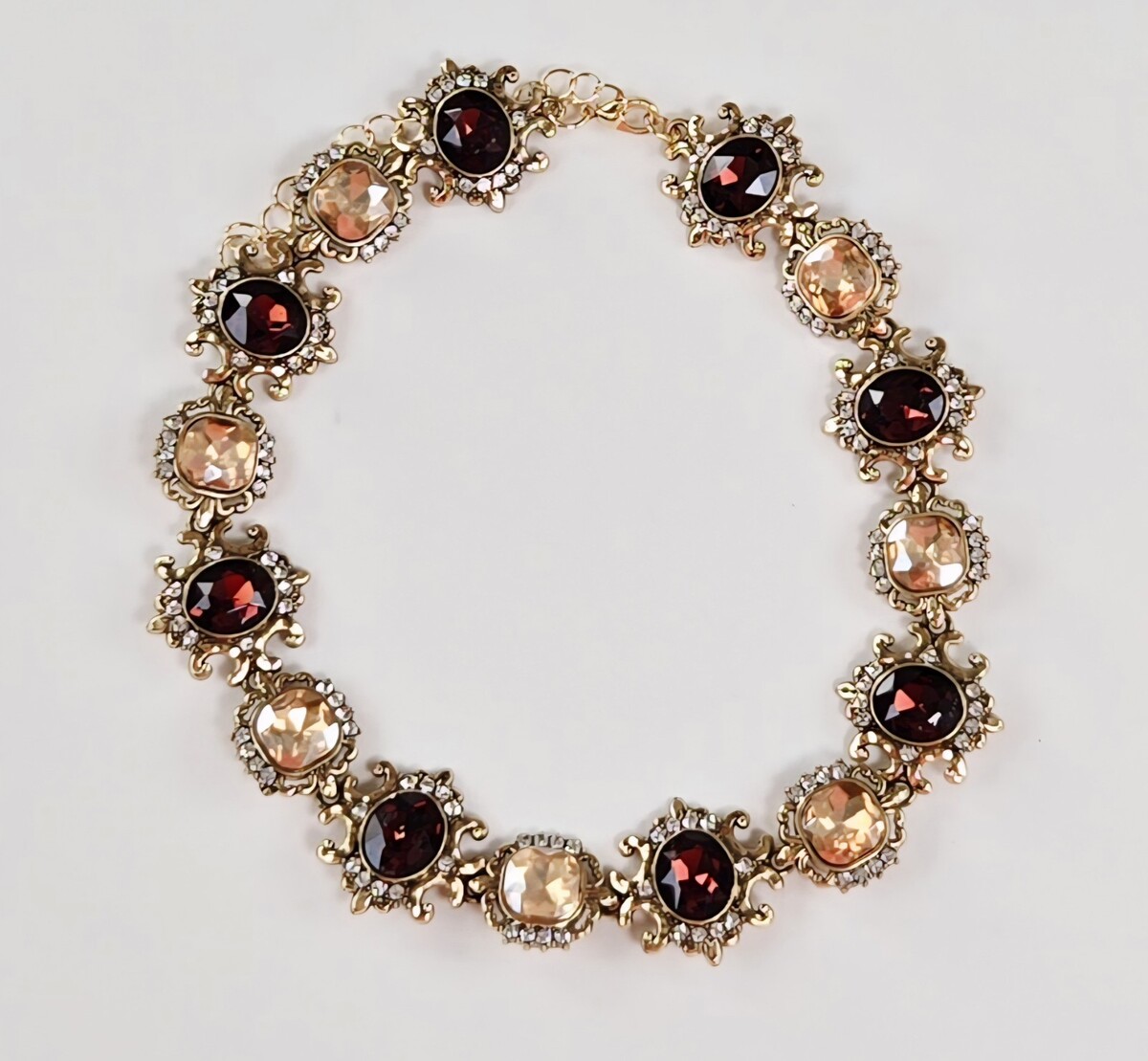 Dramatic statement piece channeling the best of Victorian revival style. This choker features a striking alternating pattern of richly colored crystals. Large round gems are a deep oxblood or smoldering garnet hue, set in ornate starburst bezels framed by small clear stones. These contrast beautifully with the cushion cut rhinestones featuring the iconic aurora borealis finish which casts a shimmering champagne amber. Set in antiqued gold tone filigree settings framed by clear rhinestones for maximum sparkle. Stunning statement piece for a dramatic, elevated look. Perfect for all occasions from prom to cocktail party. Ships boxed ready for gift giving.