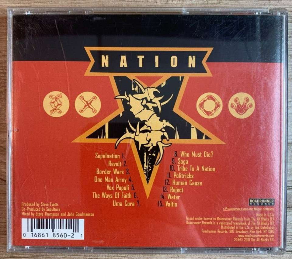This CD contains the album "Nation" by Sepultura, released in 2001 through Roadrunner Records. The album features 13 tracks of heavy and death metal, with a thrashy edge. The CD is in good condition, along with the jewel case and inlay.