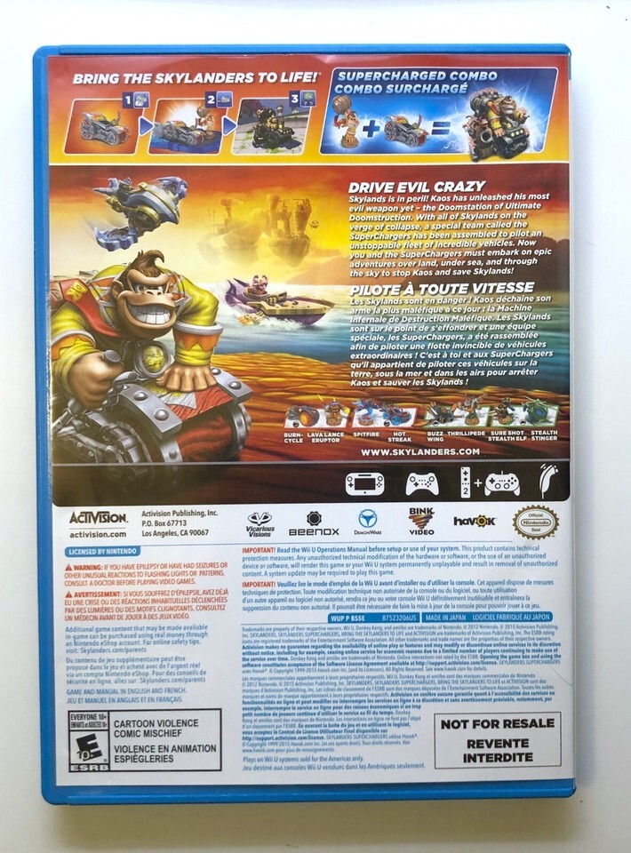 Skylanders Super Chargers Game and Portal for WiiU Activision. This comes with the game cover for WiiU and the portal. There is no packaging just what you see in the pictures. The figures have been used and there may be minor wear, overall the items are in good clean condition. I have more Skylanders and Video game items listed and combined shipping is added to your cart when you purchase multiple items at my shop. Check out my store for more toys at C C Collections | Stores