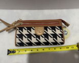 The Spartina 449 Wallet Bellinger is a stylish and functional unisex accessory crafted from leather with a black and white plaid design. This wristlet wallet features a convenient strap and zipper closure, along with the brand's signature logo accents. With dimensions of 7.5" in length and 4" in width, this wallet is perfect for organizing your essentials in a fashionable way. Perfect for any modern individual looking for a blend of practicality and high-quality craftsmanship in their accessories. see pictures, on the front a very small spot. this can come off, very small.