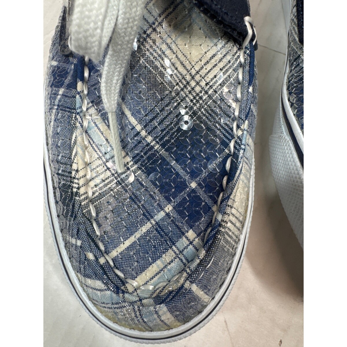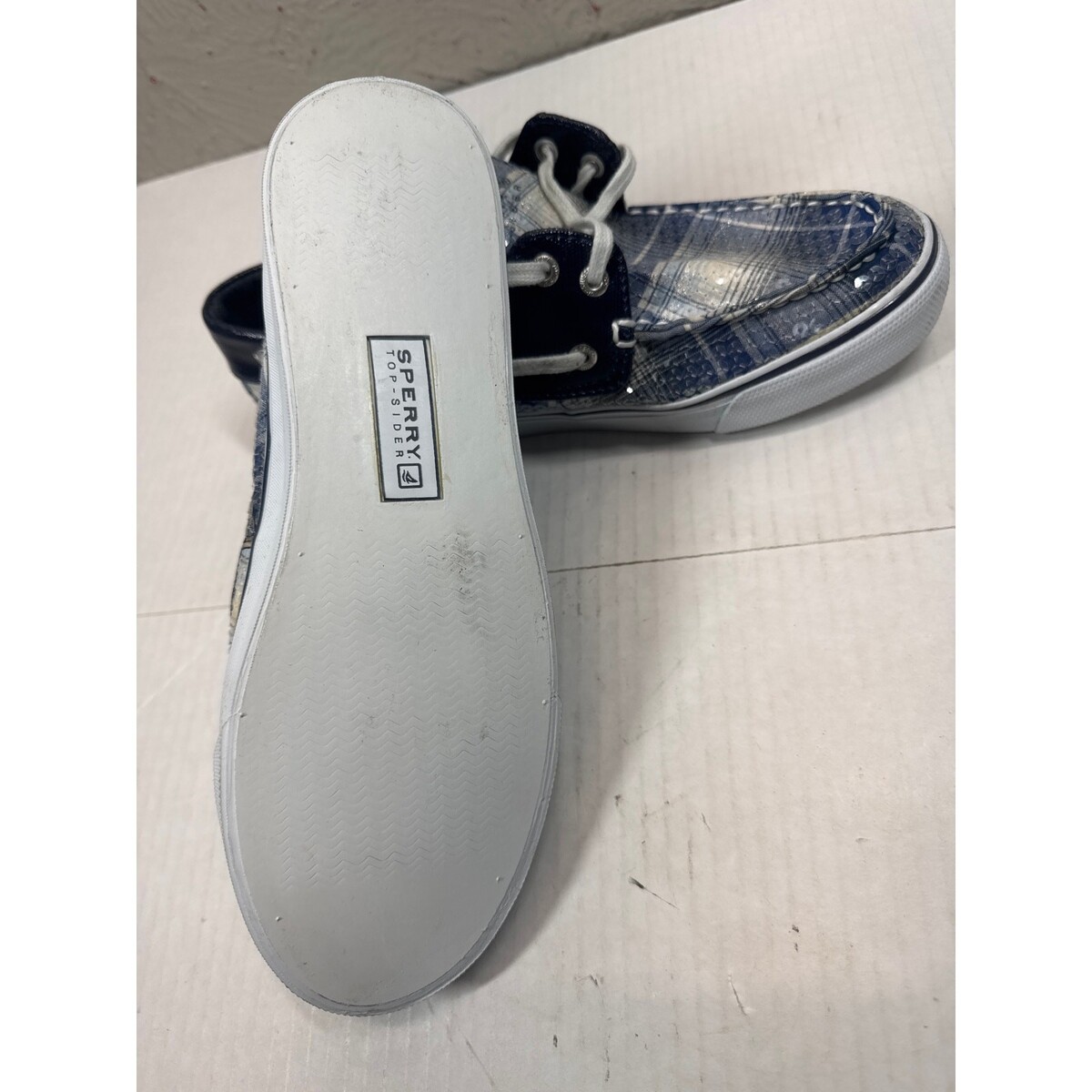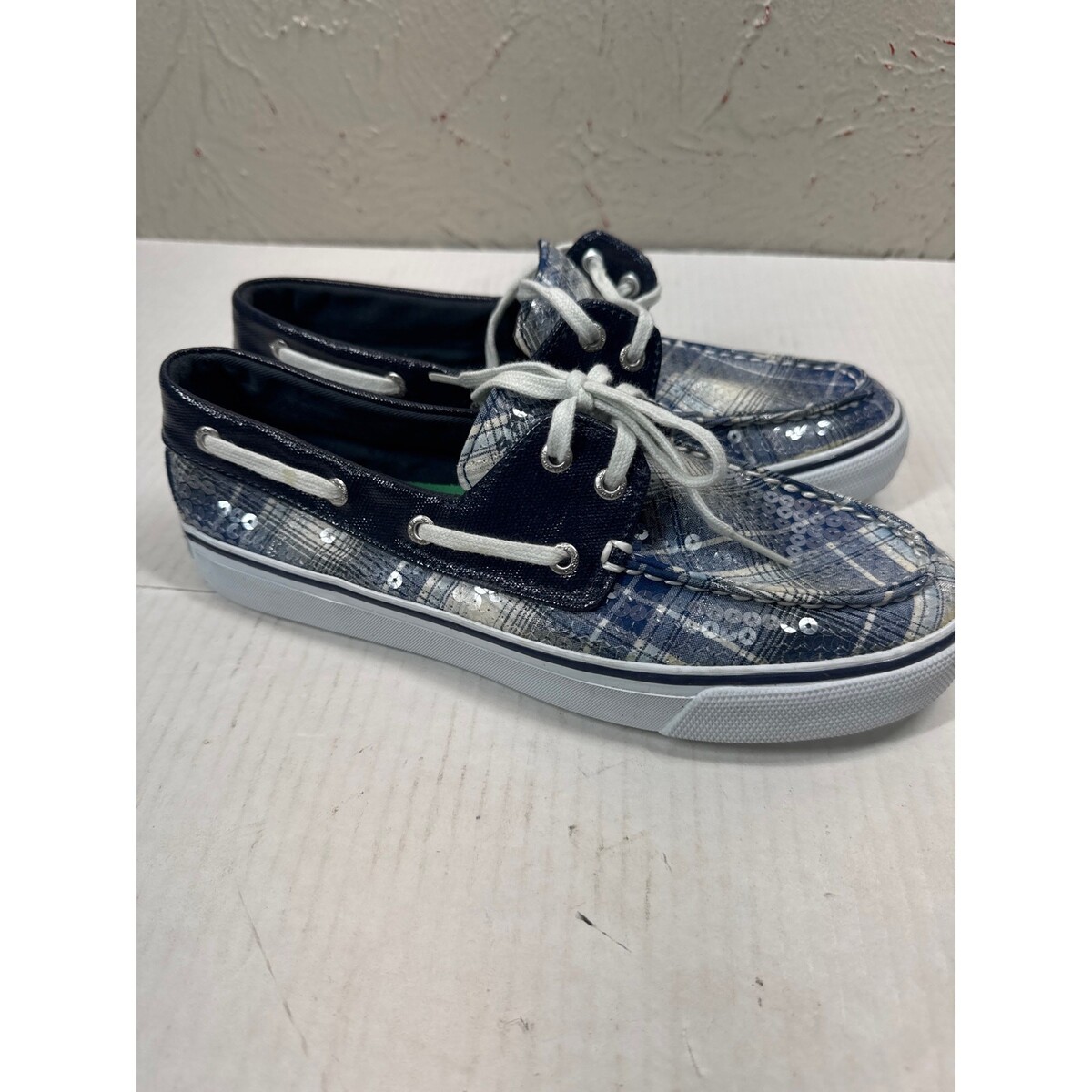 - Sperry Top Sider Womens Navy White Sequin Lace Up Flat Loafer Boat Shoe Size 7.5