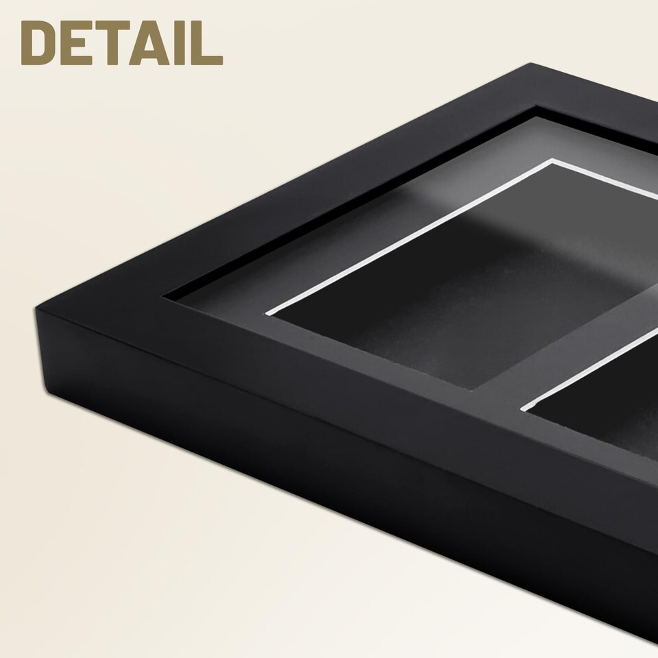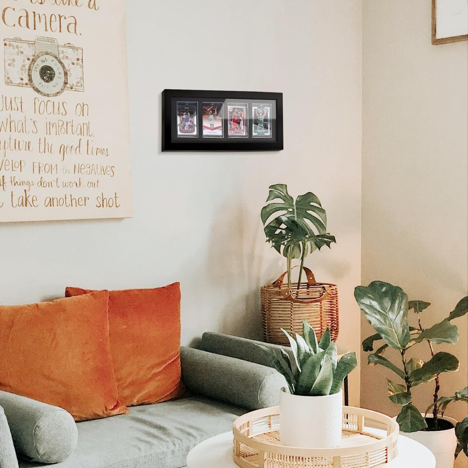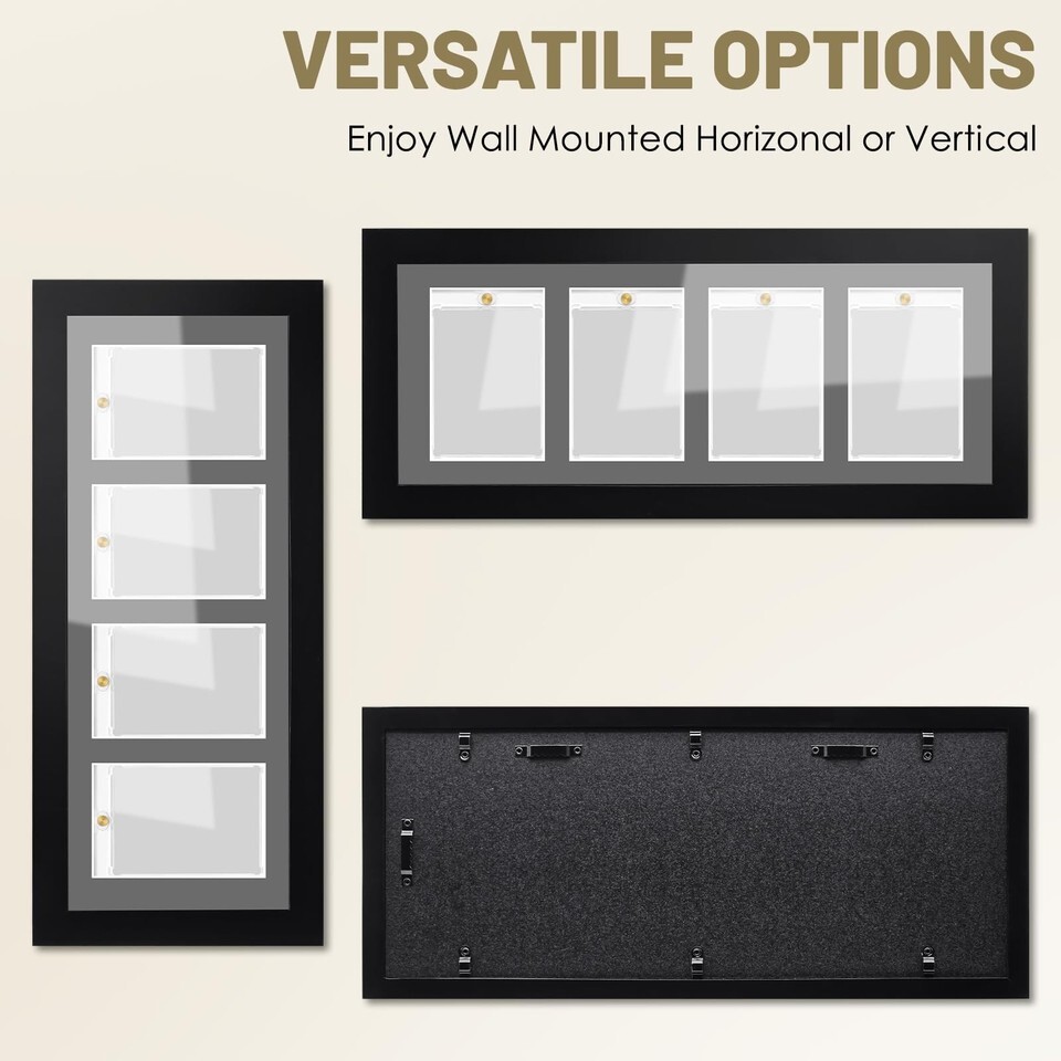 ? Wooden Classic Design ?The matt black color, the thicker frame moulding will make your favorite trading cards looking amazing in any room. This card display case is an awesome way to show off your collection. ? Double Protection for Cards ?Equipped with 35PT magnetic card holder which have UV Protection, protecting your cards from fading,bend, scratch, or crease. Moreover, there is high-transparent polycarbonate glass on the outside, which not only with double protection, isolated dust, but also displays it clearly. ? The Best Display Angle ?The card slot is cut from soft and elastic EVA, protecting your precious card, while keeping the cards at the best display angle. Besides, the card will not fall off when installing or changing cards. ? Exact Dimensions ?The frame outer size is 16.6" W X 7.5" H X 1.1" D. Each compartment cut-out size is 2.9" W X 4.3" H X 0.4" D. Complimentary 4PCS of 35PT magnetic card holders, protect your Baseball, Basketball, Hockey, Football, Pokemon, MTG, Yugioh Cards and more. NOTE: Cards not included. ? Excellent Gift Idea ?This sports card display shows unique cherished memorabilia cards for all your pride. Anyone who loves collecting cards will be thrilled by this gift?the perfect gift for your children parents friends lover who loves collecting cards. We offer 1-5 Days Free shipping 30-Days Free returns