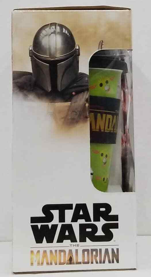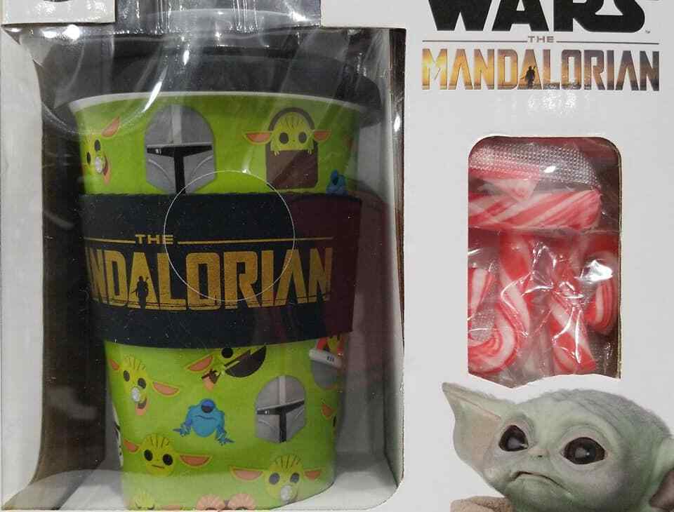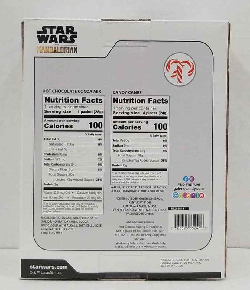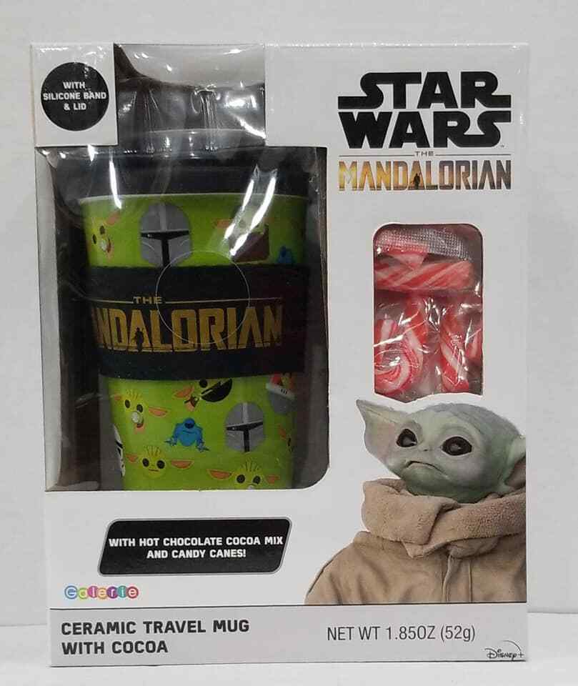 With hot chocolate cocoa mix and candy cane and ceramic travel mug. |