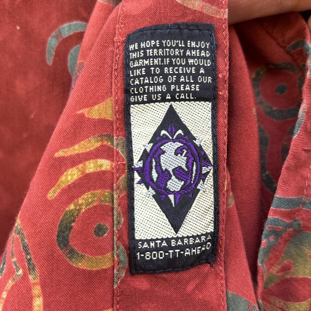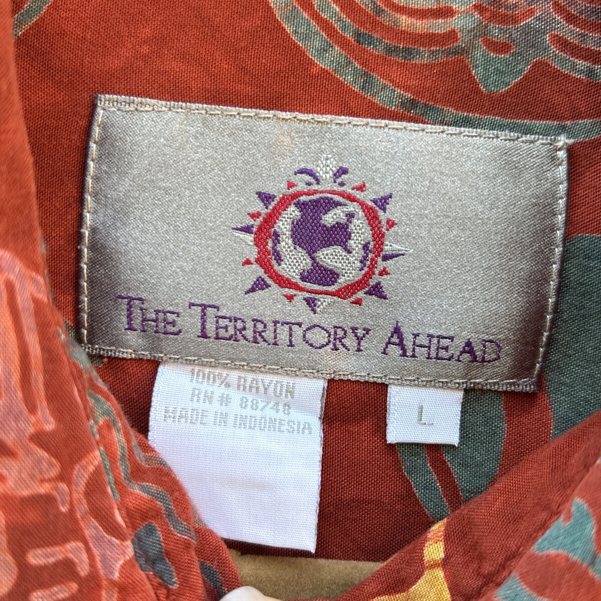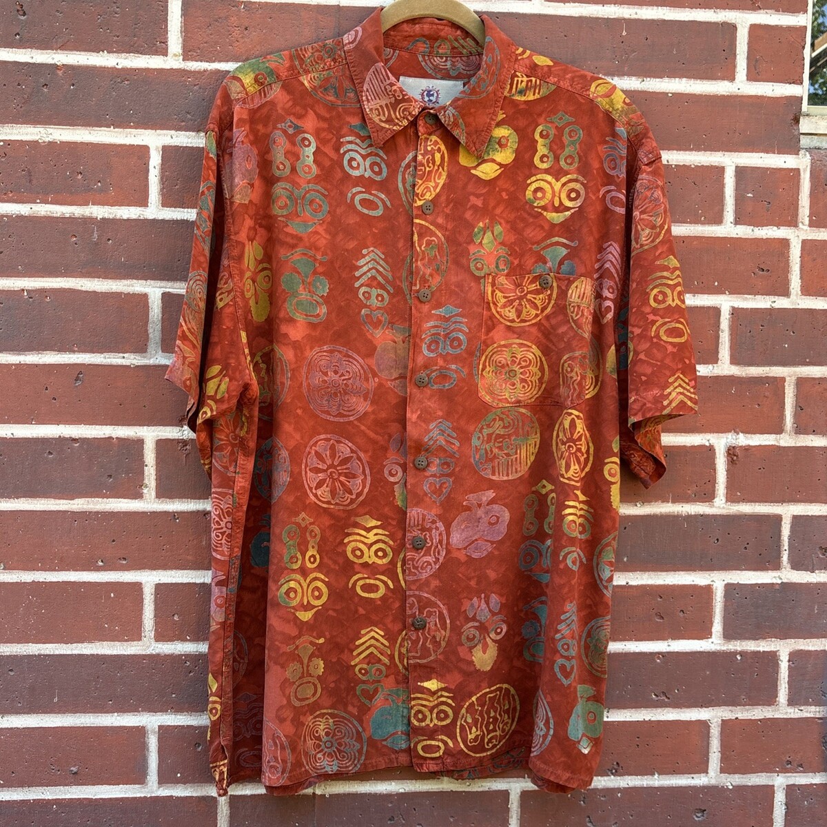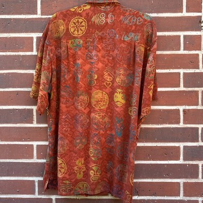 Territory Ahead Shirt Mens L Tribal Batik Short Sleeve Button Henna Tie Dye 100% rayon Coconut buttons Button front pocket Y2K late 90s era Men's Size Large Approximate (flat) Measurements: Shoulder to shoulder: 21" Armpit to armpit (chest): 26" Length: 30.5" Sleeve Length: 11" Freshly laundered and pressed. May need a touch up on arrival Smoke free, pet friendly home