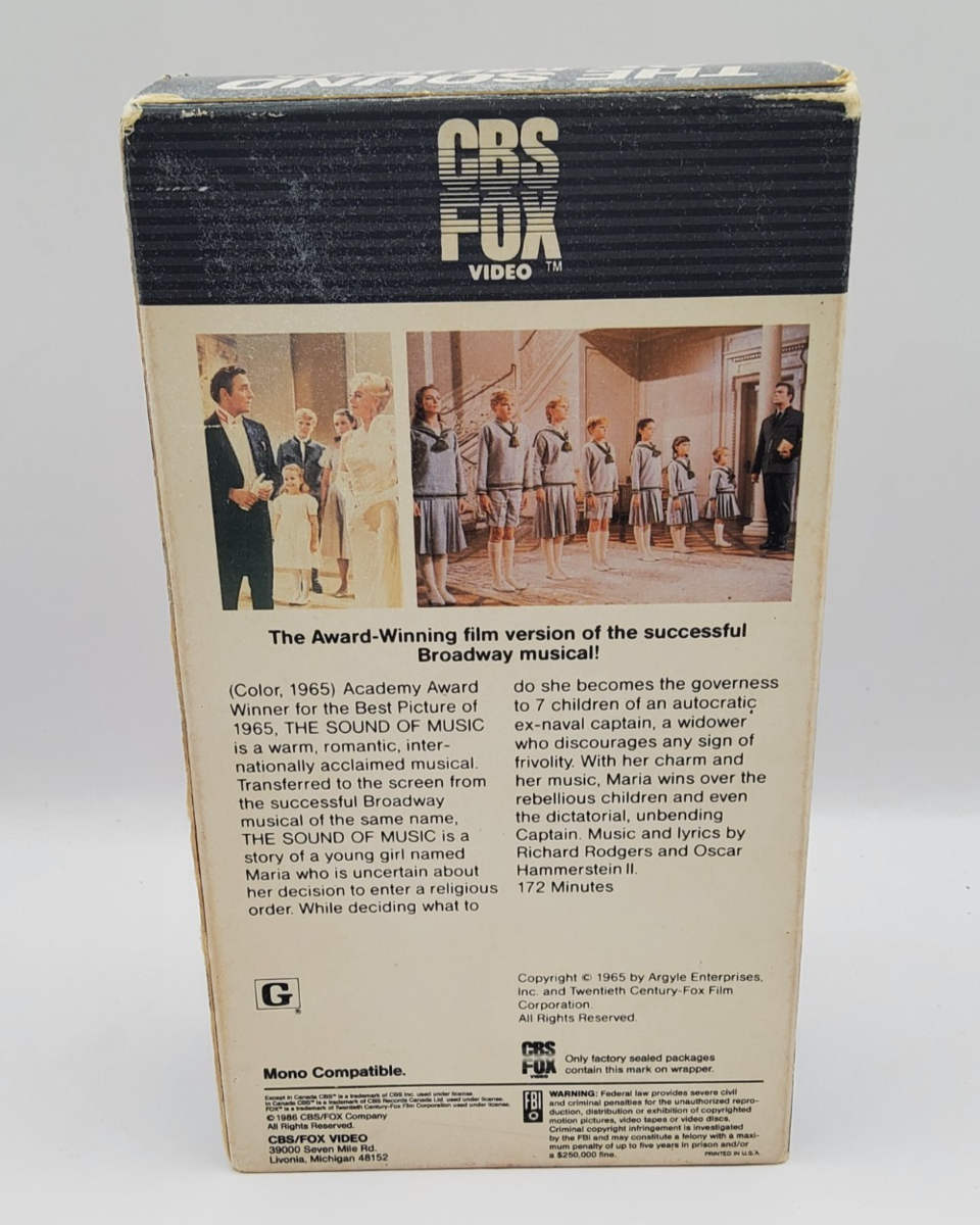 This The Sound of Music 1985 VHS edition by CBS FOX Video brings back the timeless story of Maria, Captain von Trapp, and their unforgettable songs. Winner of 5 Academy Awards, this Hi-Fi Stereo 2-tape set captures the breathtaking scenery, the heartwarming performances of Julie Andrews and Christopher Plummer, and the legendary music of Rodgers Hammerstein.